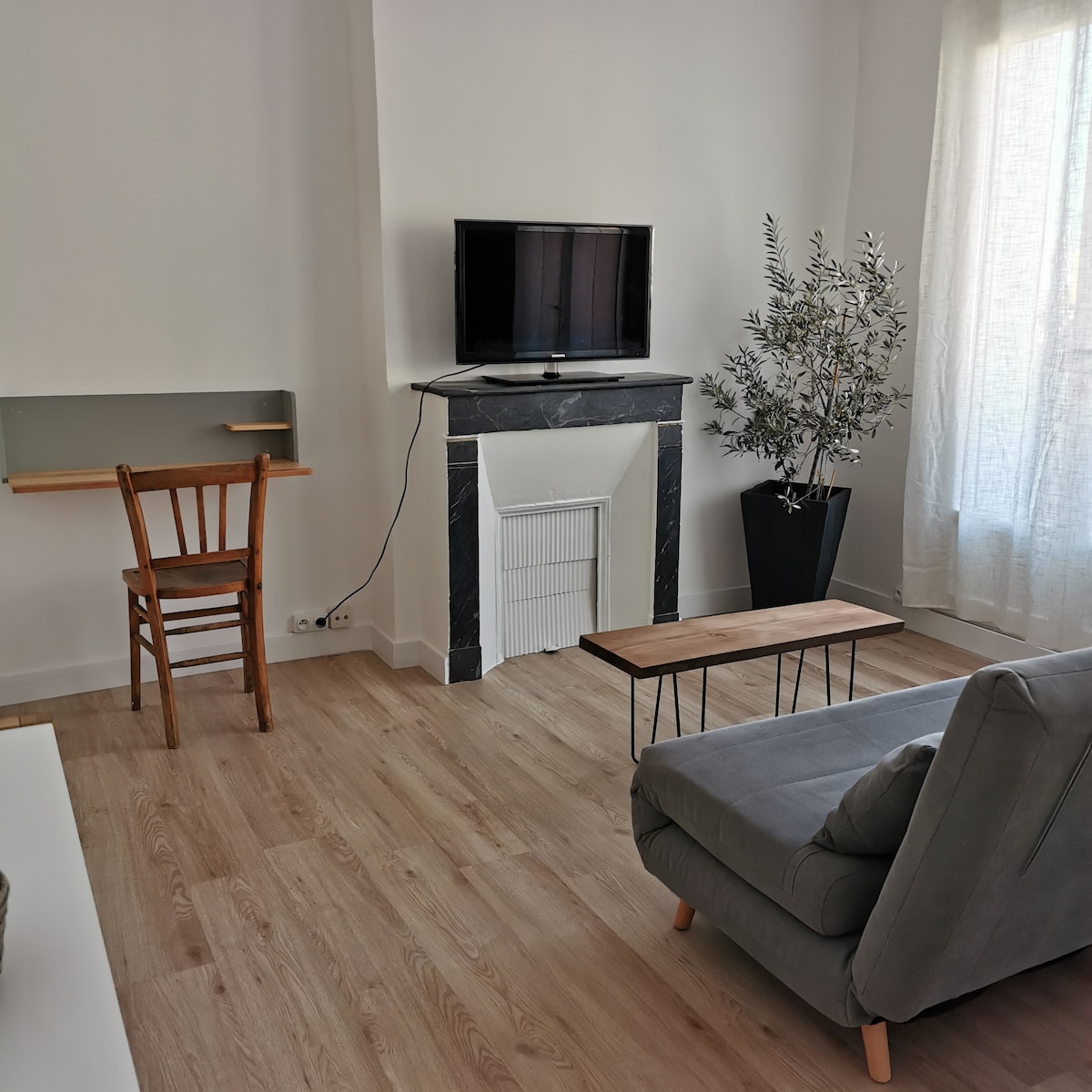 Studiolejlighed , fuldstændig renoveret, stille i en baghave. Udstyret køkken: keramisk kogeplade, mikrobølgeovn, ovn, kaffemaskine, køleskab, ECT... Stort opbevaringsskab. Badeværelse med apotek og opbevaringsmøbler samt en vægmonteret radiator, håndklædetørrer (eller badekåbe) højde 1,50 m. Ekstra sofabord. Sammenklappeligt spisebord. Sengetøj...