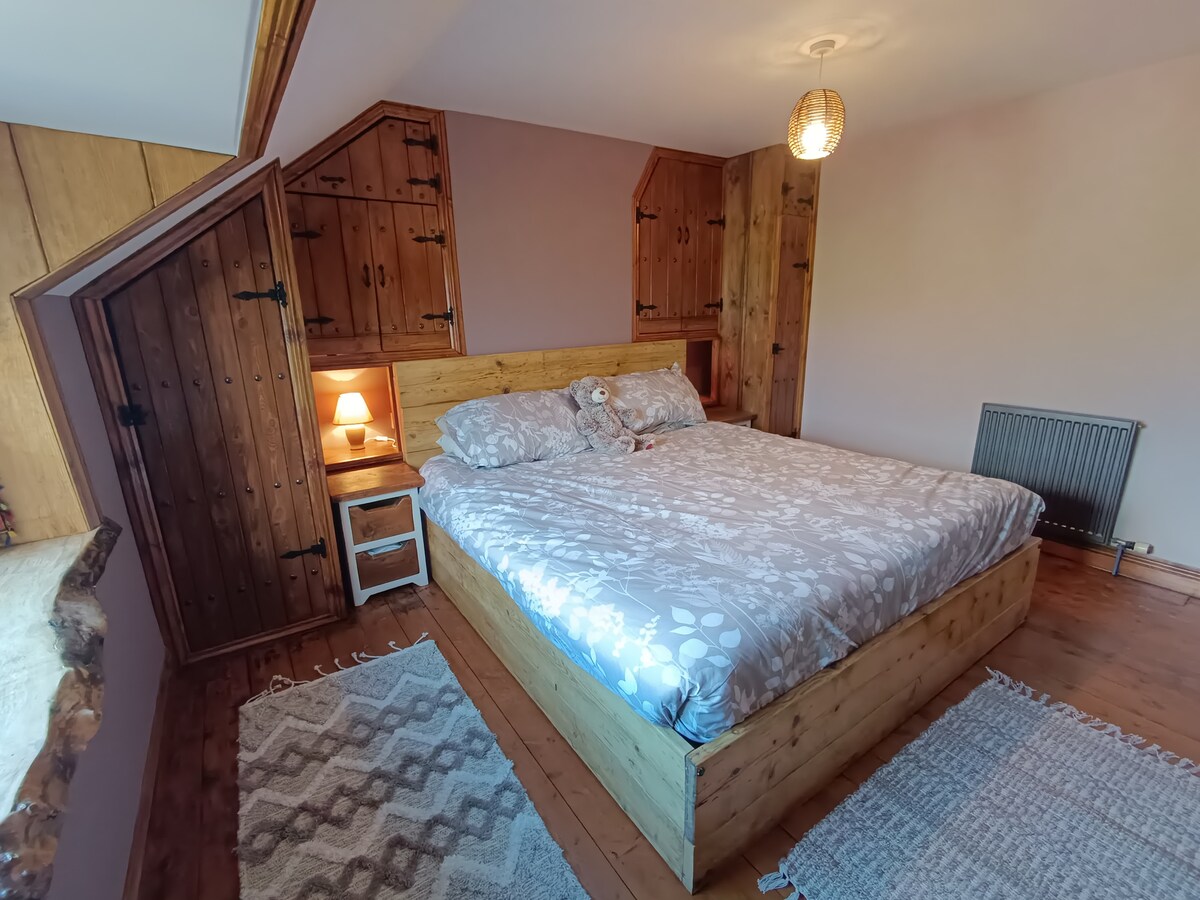 En lille bjælkehytte med Super-King-seng. beliggende i nærheden af Newtown i Mid Wales beliggende på en lille fungerende gård *Hjemme med egen forplejning* KUN FOR VOKSNE Et en-suite brusebad og en studiolejlighed gør denne hytte perfekt til en kort pause på landet. Oil Centralvarme Elektrisk ovn og komfur, køleskab, mikrobølgeovn, brødrister og kedel. Freeview & FreeSAT-tv, udvalg af bøger, spil og dvd'er og wi-fi overalt. Sofa og morgenmad sidebord. Fælles grill og udendørs siddeområde og bålpladser