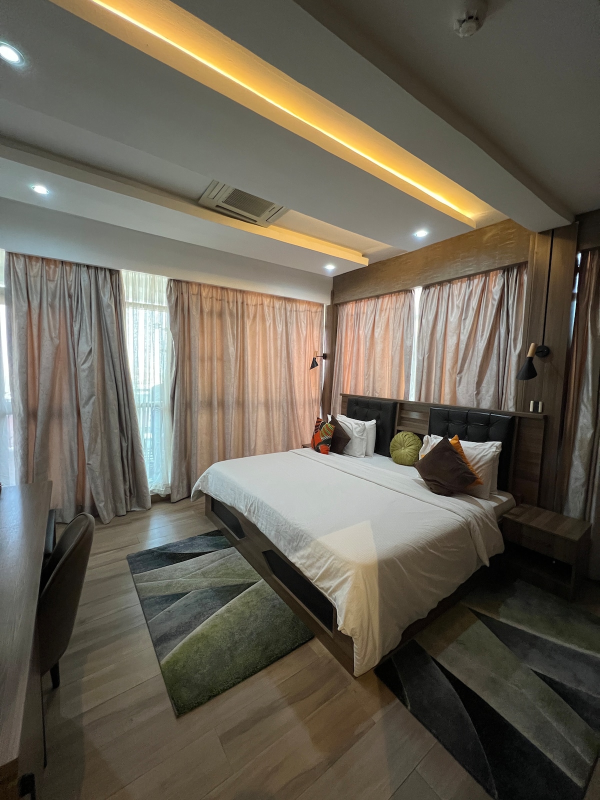 Experience the best of Abuja in our serene one room which gives off an uplifting energy. With soft lighting beneath the bed and warm tones, it brightens up your stay for a truly relaxing experience. Enjoy a restful night's sleep on our plush queen-size bed, stay entertained with smart TV and Netflix, and stay connected with fast Wi-Fi. Enjoy a private attached bathroom with a heater for a warm cozy bath and mini fridge. Perfect for solo travelers, getaways, couples, and business executives.
