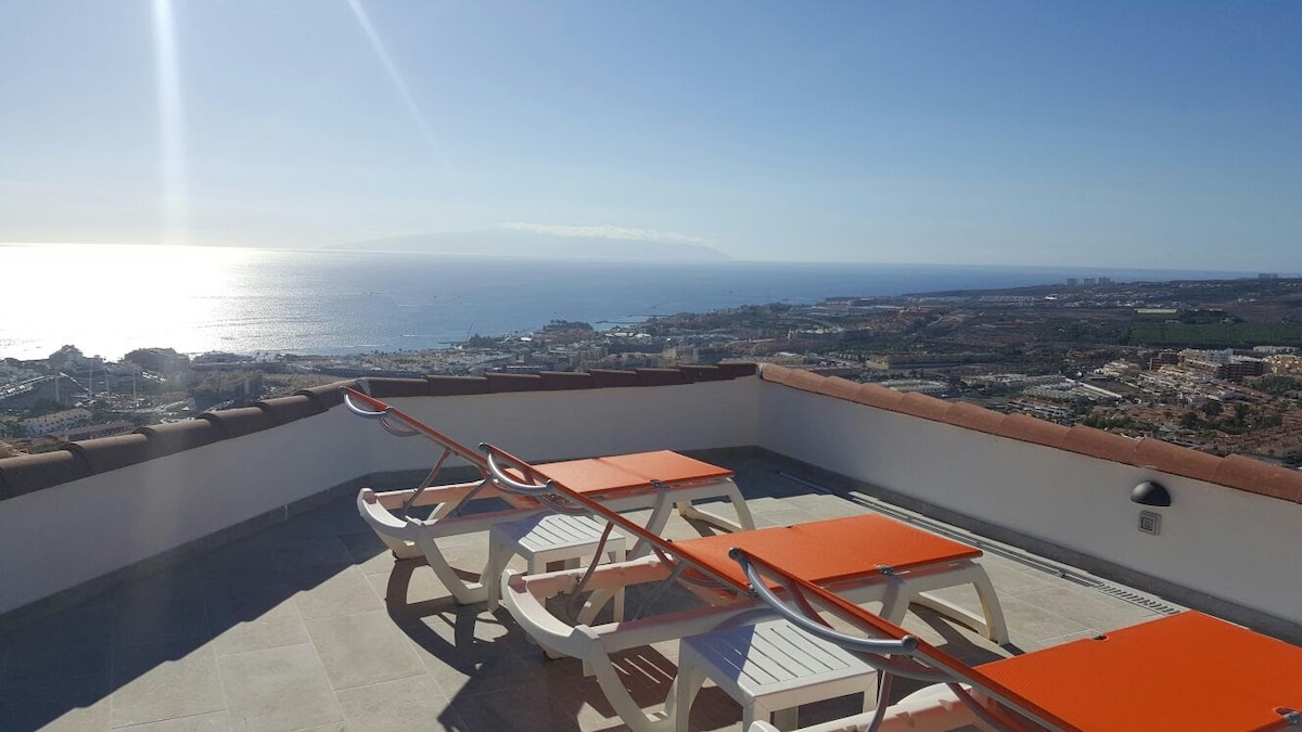 Velkommen til vores smukke duplexlejlighed beliggende i et af de smukkeste komplekser i den sydlige del af Tenerife "Adeje Paradise Der er 2 etager, hver med sin egen terrasse og spektakulær havudsigt På terrassen nedenunder er det vidunderligt at vågne op med en kop kaffe, solbaldakin til rådighed, så det altid er behageligt at kigge efter skygge. På tagterrassen kan du solbade/nyd et glas vin ved smukke solnedgange Poolbar Sikkerhed døgnet rundt gratis parkeringsplads