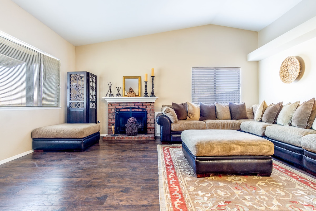 Relax with the whole family! Spacious 3 bedroom+guest room/ two 1/2 bath Home. Located in a safe and friendly centrally located community. The entire home is the true definition of comfort living with accents and furnishings. The fully equipped home offers comfortable living w/Wi-Fi, smart TV, coffee maker, washer + dryer, pool, bbq, fire pit and more! Close to restaurants, Victor Valley Mall, Scandia, Movies, 15 FWY, 395 HWY, Ontario Mills & Airport.