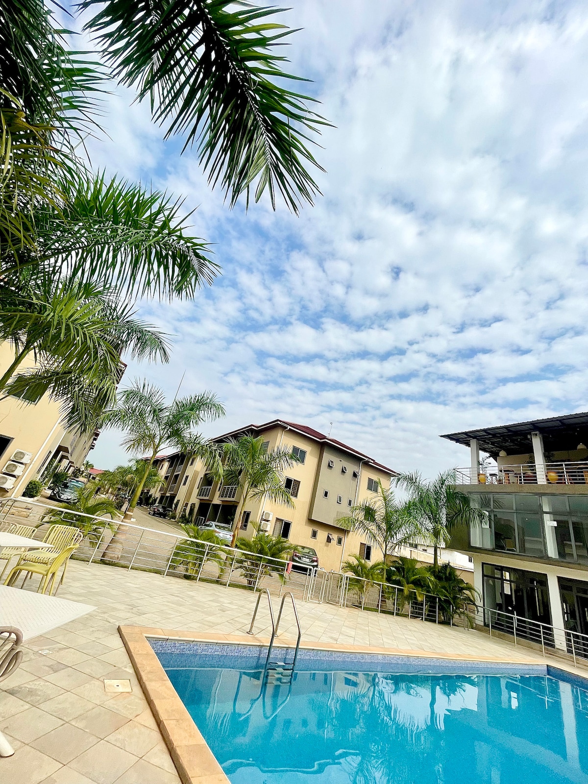 Velkommen til din eksklusive byferie i Accra! Med en fantastisk udsigt over Aburi-bjergene, kun et par minutter væk i bil eller 15 minutters gang. Under 12 miles fra lufthavnen, lige på M4 uden sving. Vores lejlighed med to soveværelser tilbyder glæde og komfort med sikkerhed døgnet rundt, elektricitet og vand døgnet rundt, med eksklusive faciliteter såsom en pool, tagterrasse, moderne fitnessrum, fuldt køkken, wi-fi, grill og meget mere, der vil gøre dit ophold virkelig uforglemmeligt.