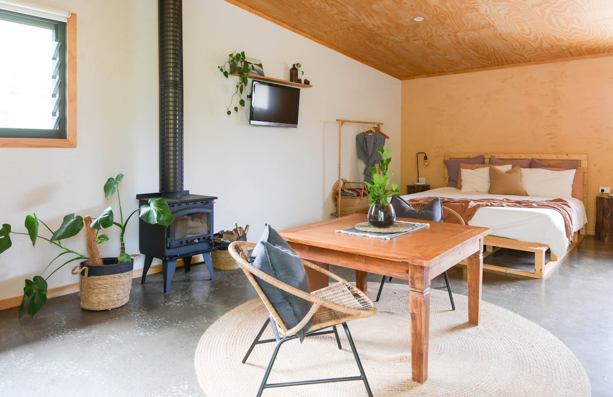 A rustic studio attached to the family home, with its own entrance. Refresh with a complimentary cheese board. Enjoy the plant filled space where you can enjoy a breakfast of fresh bread, eggs, cereal, milk, butter, jam, honey & coffee. At night light the fireplace with the wood provided. Take the picnic basket and rug provided, & explore the Mountain. We are located on the Main Road leading into Gallery Walk. If you are sensitive to road noise we might not be the perfect place for you.