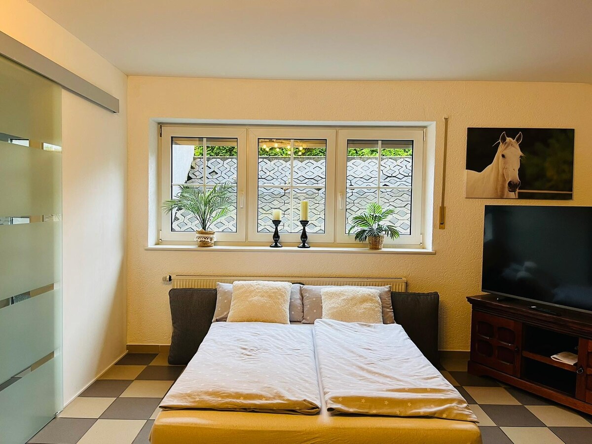 Afslappende landferie i Siebengebirge eller behageligt forretningsophold i vores smukke, lyse studielejlighed (ca. 50 m²) i rolige omgivelser med separat indgang og udendørs siddepladser. Lejligheden ligger i Königswinter Bergområde ved foden af Olberg og er et perfekt udgangspunkt for vandreture. Den er ideel til en lille familie, vandrere eller cyklister. Der er mange muligheder for udflugter i nærområdet eller længere væk.