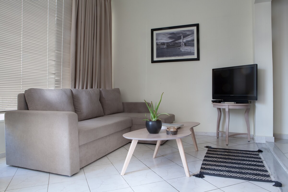 Sol central lejlighed ligger i centrum af Chania. Den er behagelig, lys og rummelig og tilbyder bekvemmelighed, ro og alle de tjenester, der opfylder selv de mest krævende kundestandarder. Det er en minimal lejlighed ved siden af det centrale marked, den gamle havn og kun 800 meter fra Nea Chora-stranden.