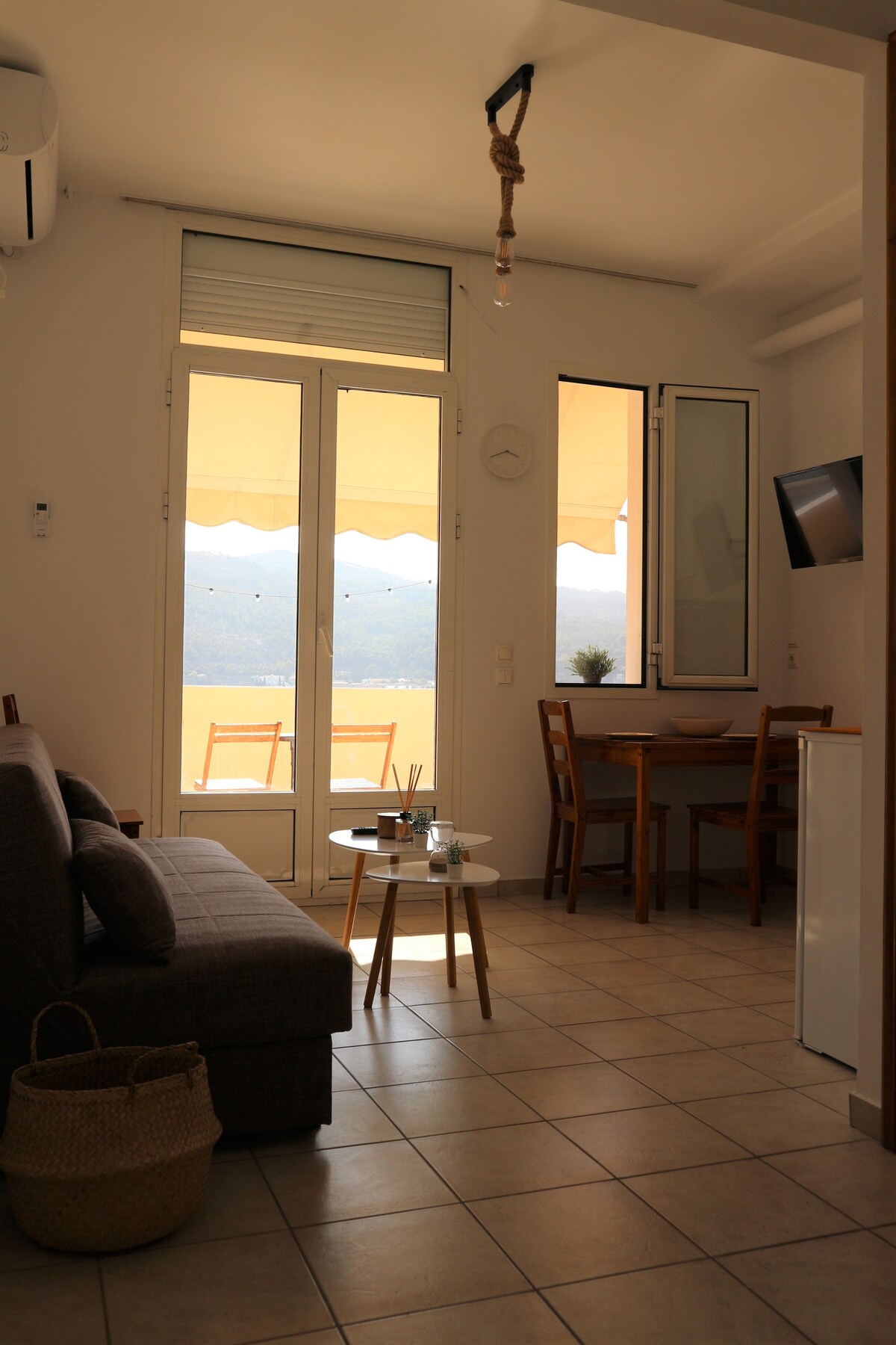 Sea View-lejligheden er designet til at give den komfort og frihed, du leder efter til din ferie. Få rigtige skridt væk fra den smukke og hyggelige Psili Ammos sandstrand. Ved at forblive tro mod vores navn får du ubegrænset havudsigt og smukke solnedgange med udsigt over Psili Ammos-stranden. Perfekt til din morgenkaffe og din aftenvin. Vi opfordrer dig til at koble af og slappe af! Det er et perfekt sted for par. Vært: Chris & Artemis. Tak, fordi du valgte os