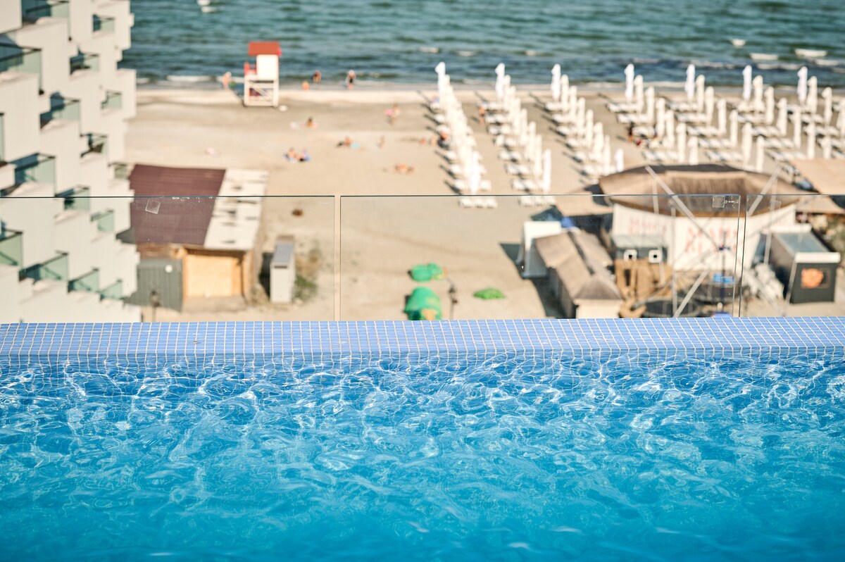 Un studio elegant , modern si primitor pe piata imobiliara de vacanta ,cu iesire la plaja cuprinsa intre Acapulco si Steaua de Mare , la 5 minute de mers pe jos de faleza unde se coboara pe plaja , este dotata complet pentru o vacanta in familie la mare .Poate constitui un punct de plecare eficient spre diferite puncte turistice din zona : Techirghiol 2km , plaja salbatica Tuzla 10km , Costinesti 15km, Mangalia 35 km , Vama Veche 35 km, plaja salbatica Vadu 42km si Corbu 35km.Vacanta cu soare !