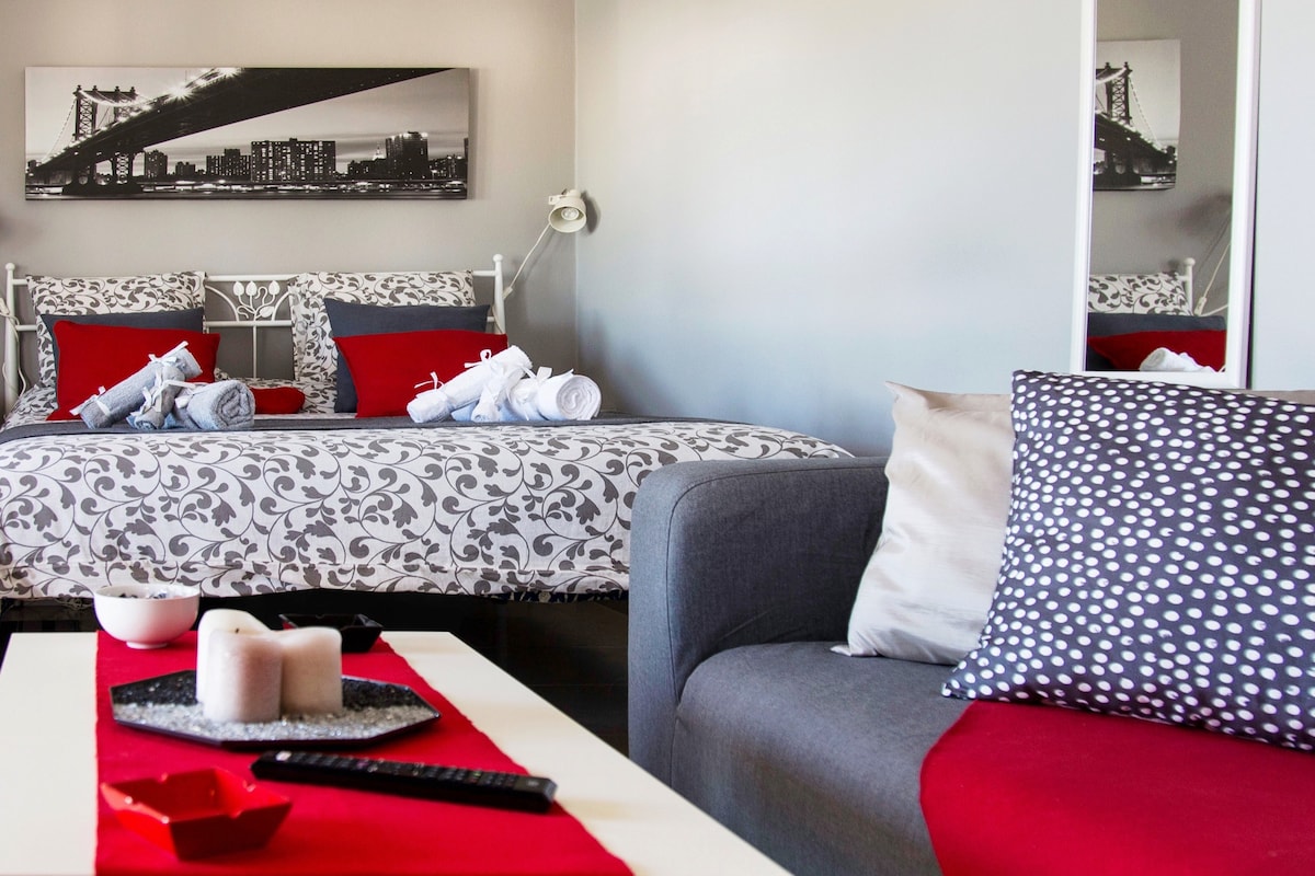 Graffiti Studio 30 m2 på første sal og klar til at byde 2 gæster velkommen. Dafni-området har en metrostation og mange buslinjer. Studiet er fuldt udstyret og stilfuldt. Beliggende i et sikkert familieområde ved siden af et torv med caféer, supermarkeder og restauranter. Det er et minut til Dafni-metrostationen (rød linje), kun 4 stop til Akropolis, fem stop til Syntagma og et stop til et stort indkøbscenter. Studiet er levende og har en fantastisk stemning! Vær vores gæst.