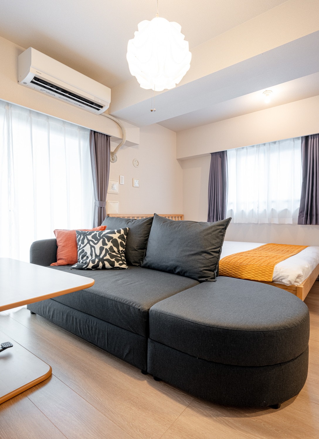 Et roligt, minimalistisk loft kun et stop fra Shibuya og Roppongi – perfekt til solorejsende eller fokuseret fjernarbejde. Med hurtig wi-fi, en Aeron-stol og en kompakt dobbeltseng (150×210 cm) – ideel til én, hyggelig til to. Det glasklædte badeværelse og de elegante betonvægge giver det et moderne touch (bemærk: der er lidt vinterkondens – tænd blot for badeværelsesventilatoren). Der er ikke noget skab, men der er plads til fire store kufferter, og der er en ophængningsstang og ti knager til væggen, så det kan holdes ryddeligt. Der er vasketøjsservice hver uge.
