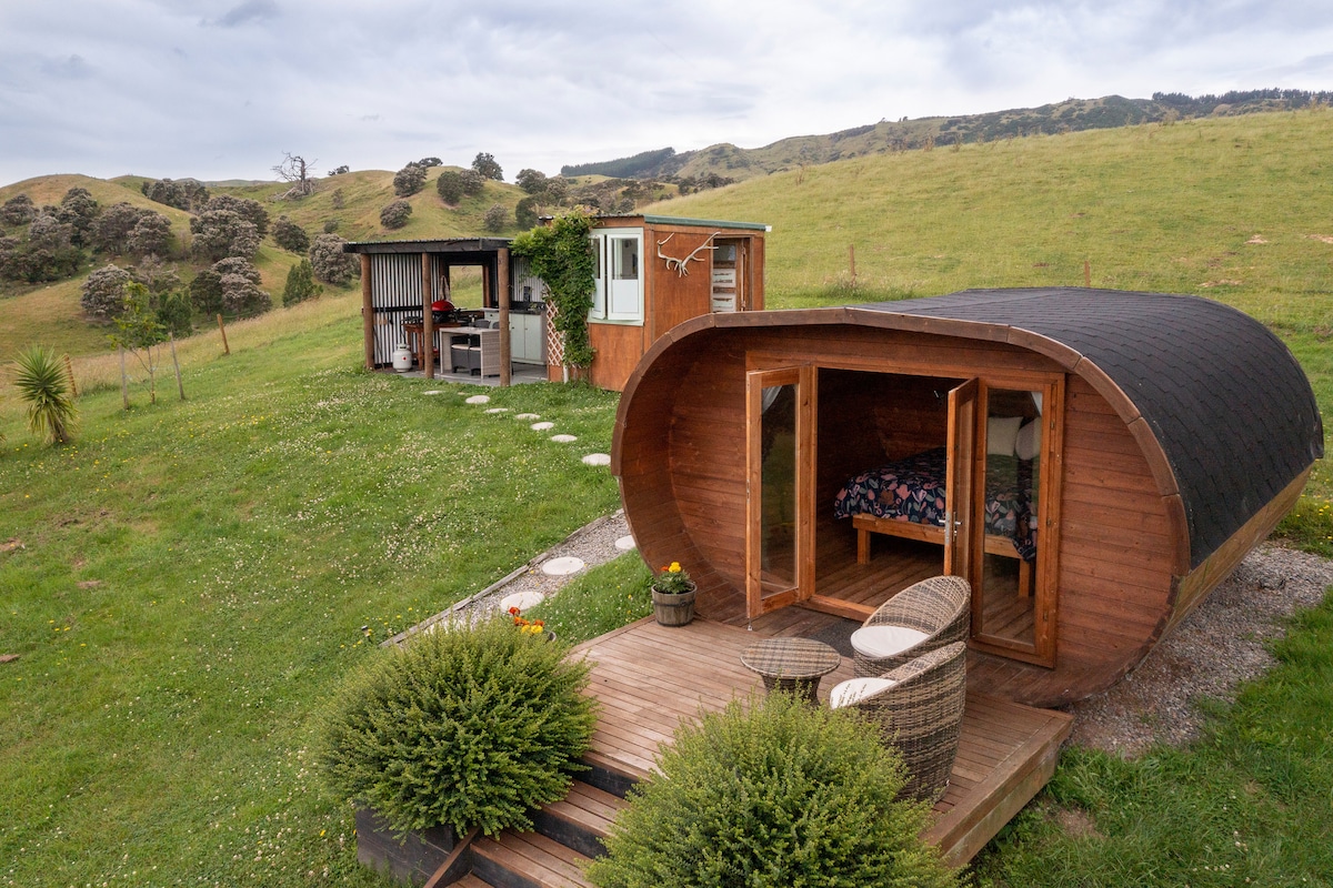 Richcrest Cabin er bygget til to personer. Uden indlagt strøm og miljøvenlig. Beliggende ved siden af en lille sø og helt privat. Nyd selskab med New Zealands smukke fugle, Tui, Fantail og en overflod af Kereru. Hytten giver et fantastisk fredeligt privat tilflugtssted for at undslippe det moderne livs fælder. Dobbeltglas, fuldt isoleret, uendelig gas og en 100 år gammel grævlingetræ til at slappe af under. Beliggende på en traditionel newzealandsk gård med får og oksekød.