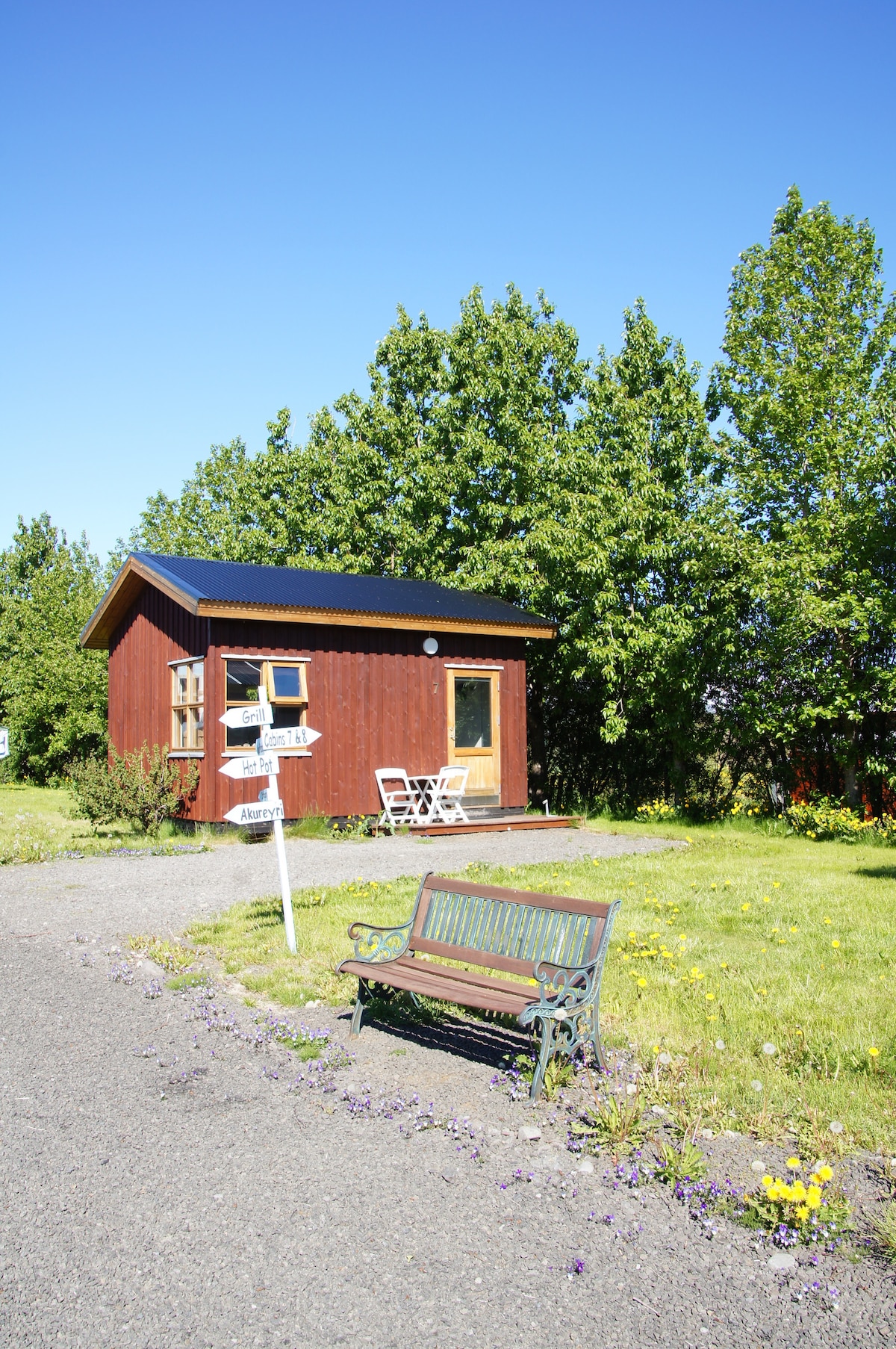 Dette er en privat, hyggelig hytte, der passer til to voksne. Det er muligt at tilføje en ekstra seng til et barn. Hytten er indrettet med to enkeltsenge, et bord og stole. Der er en kaffemaskine, kedel og et lille køleskab. Badeværelse med bruser. Dette er en del af vores familiedrevne gæstehus. Beliggende 5 km nord for Akureyri på landet med en smuk udsigt over Eyjafjörður.