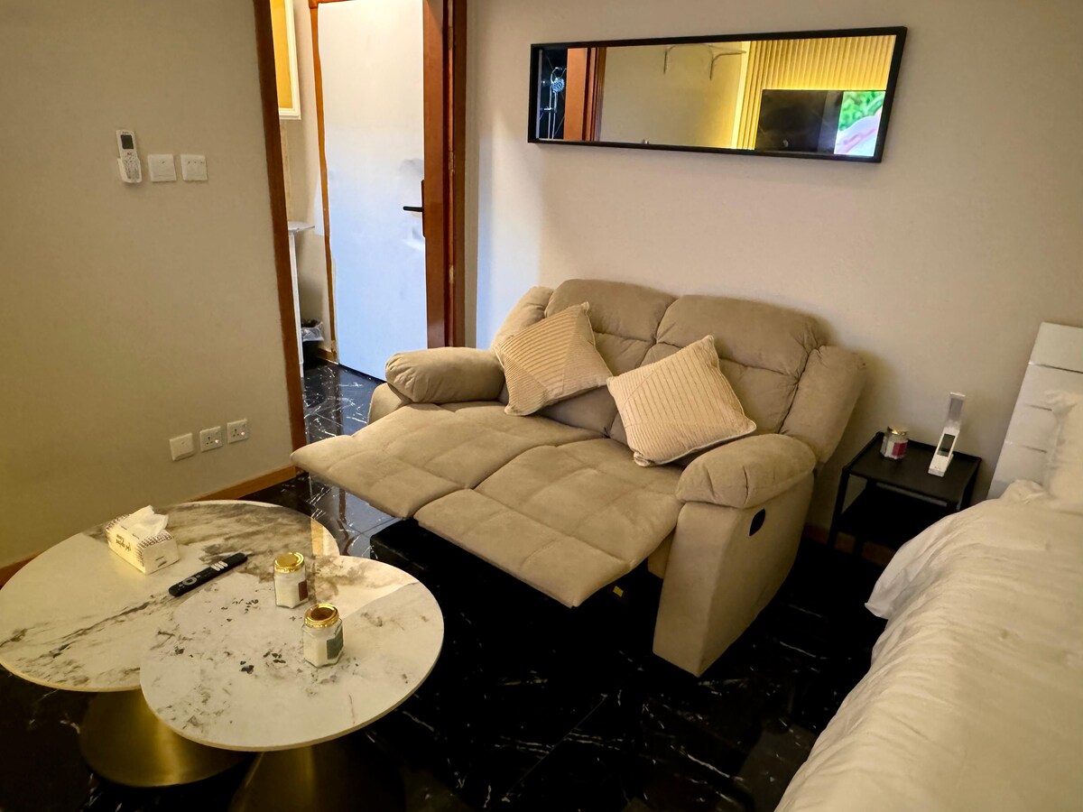 Nyd et luksuriøst ophold i Ora-suiten To soveværelser i hjertet af Al-Khobar Den omfatter en hjemmebiograf med en 100-tommers skærm og lydanlæg, et kaffehjørne med en espressomaskine og en professionel popcornmaskine, der fuldender biografstemningen 🍿🎥 Forskellige fritidsspil til at underholde gæster 🎲 og en elegant indendørs gynge Og et fuldt udstyret køkken med de nyeste elektriske apparater 👩🍳 Det største rum har en 65-tommers skærm. En særlig beliggenhed tæt på Dhahran Expo, Al-Raka Corniche og Al-Mousa Park. Indtjekning uden vært for fuldstændig privatliv og komfort. Perfekt til familier eller forretningsrejsende
