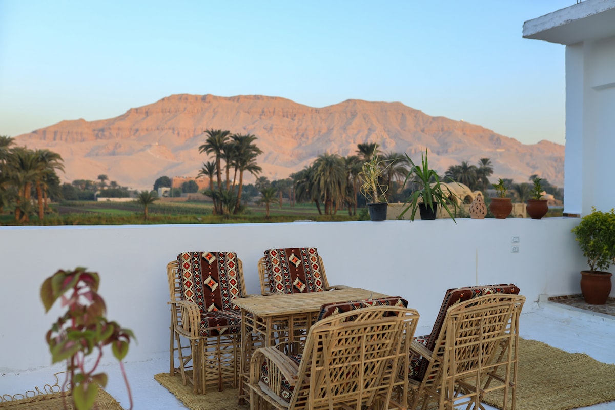 Come and enjoy this spacious, peaceful family friendly home with a beautiful view of the mountains just steps away from Luxor’s most famous sites! Wake up to the song of birds and have your morning coffee on the terrace while watching the hot air balloons rise over the Valley of the Kings! This home offers numerous opportunities to enjoy many memorable mornings in Luxor while also offering the perfect place to rest and recharge.