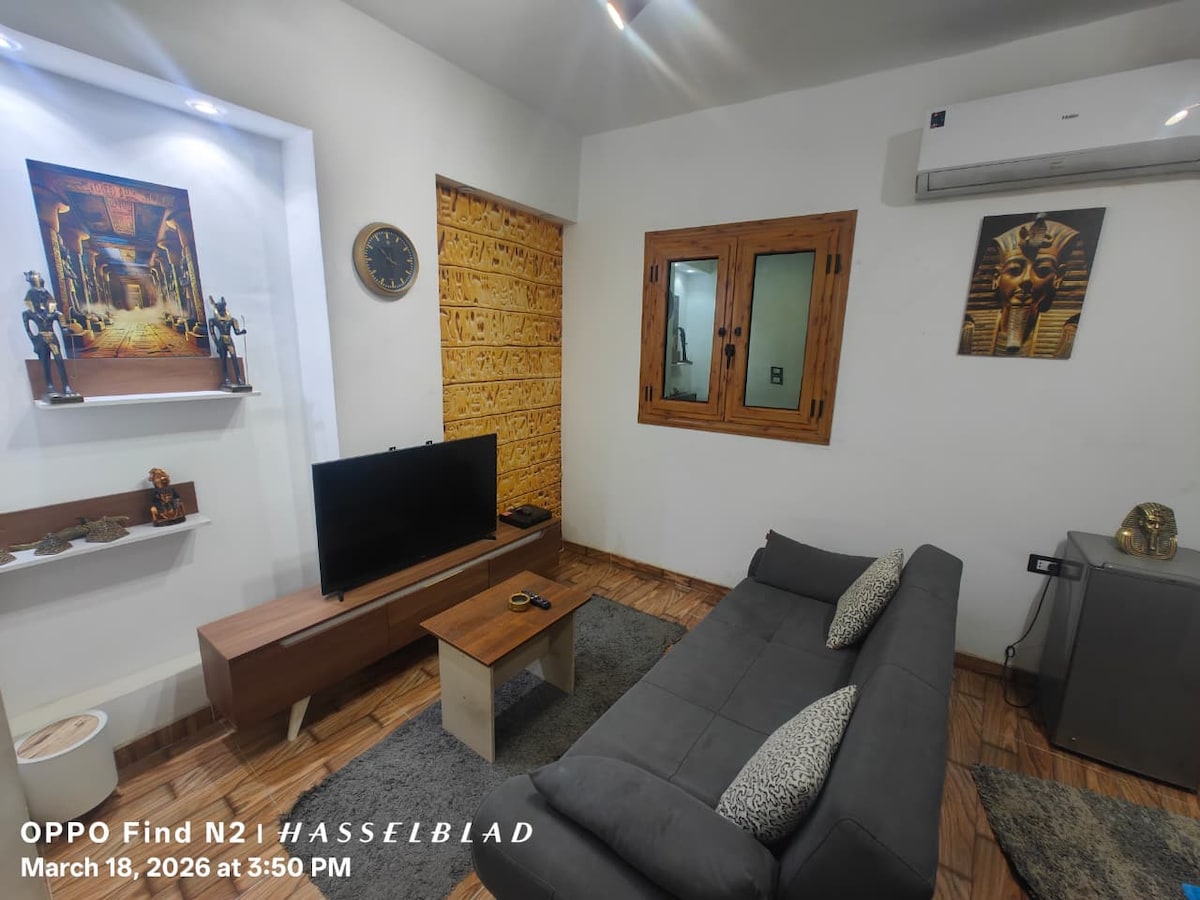 Velkommen til din luksuriøse smuttur i Giza! Denne moderne studiolejlighed er perfekt skræddersyet til at tilbyde både stil og funktionalitet, og det kombinerer moderne design med elementer inspireret af den rige faraoniske arv. Beliggende tæt på de store pyramider og det store museum, er dette sted et ideelt tilflugtssted for dem, der sætter pris på komfort indhyllet i kultur.
