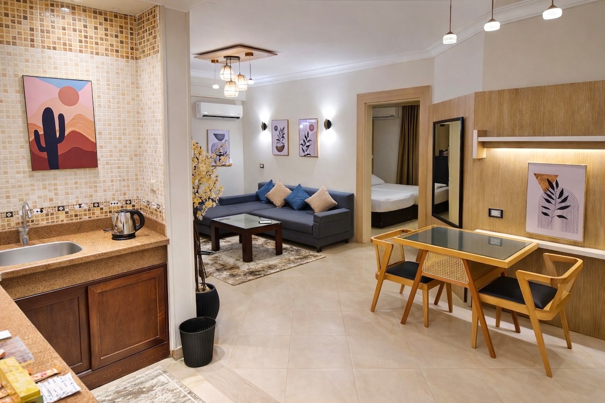 Du vil ikke glemme denne trendy hybel, der passer til 3 gæster. Har 1 soveværelse med kingsize-dobbeltseng med luksusjacuzzi og trådløs massageapparat, mens du ser 55" Samsung smart-tv for en enestående oplevelse på én gang. Det er perfekt til par, solorejsende og forretningsrejsende. Har også et komplet badeværelse, åbent tekøkken fuldt udstyret Start din morgen med en lækker kop Nespresso og to gratis kapsler. Bemærk, at arabiske og egyptiske borgere skal indsende dokumentation for ægteskab inden indtjekning.