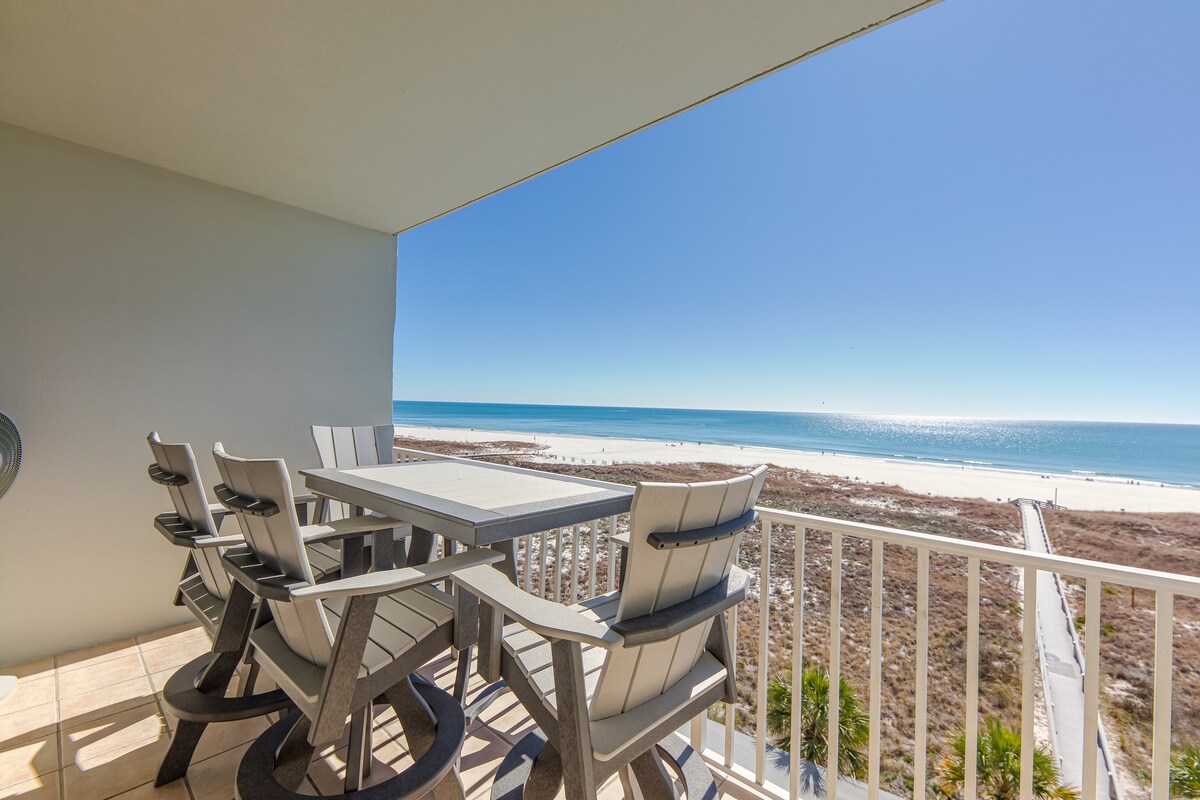 Du vil elske denne rummelige lejlighed med 3BR/2BA ved stranden! Nem adgang til hvide sandstrande med sukker - bare en kort strandpromenade! Du vil elske den smukke havudsigt og pooludsigten fra både stuen og soveværelset! Begge værelser har glasdørindgange til din altan foran bugten, der er udstyret med et terrassebord og stole. Du kan nyde at drikke din morgenkaffe eller få et glas vin ved solnedgang på balkonen, mens du nyder den smukke udsigt over Mexicogolfen.