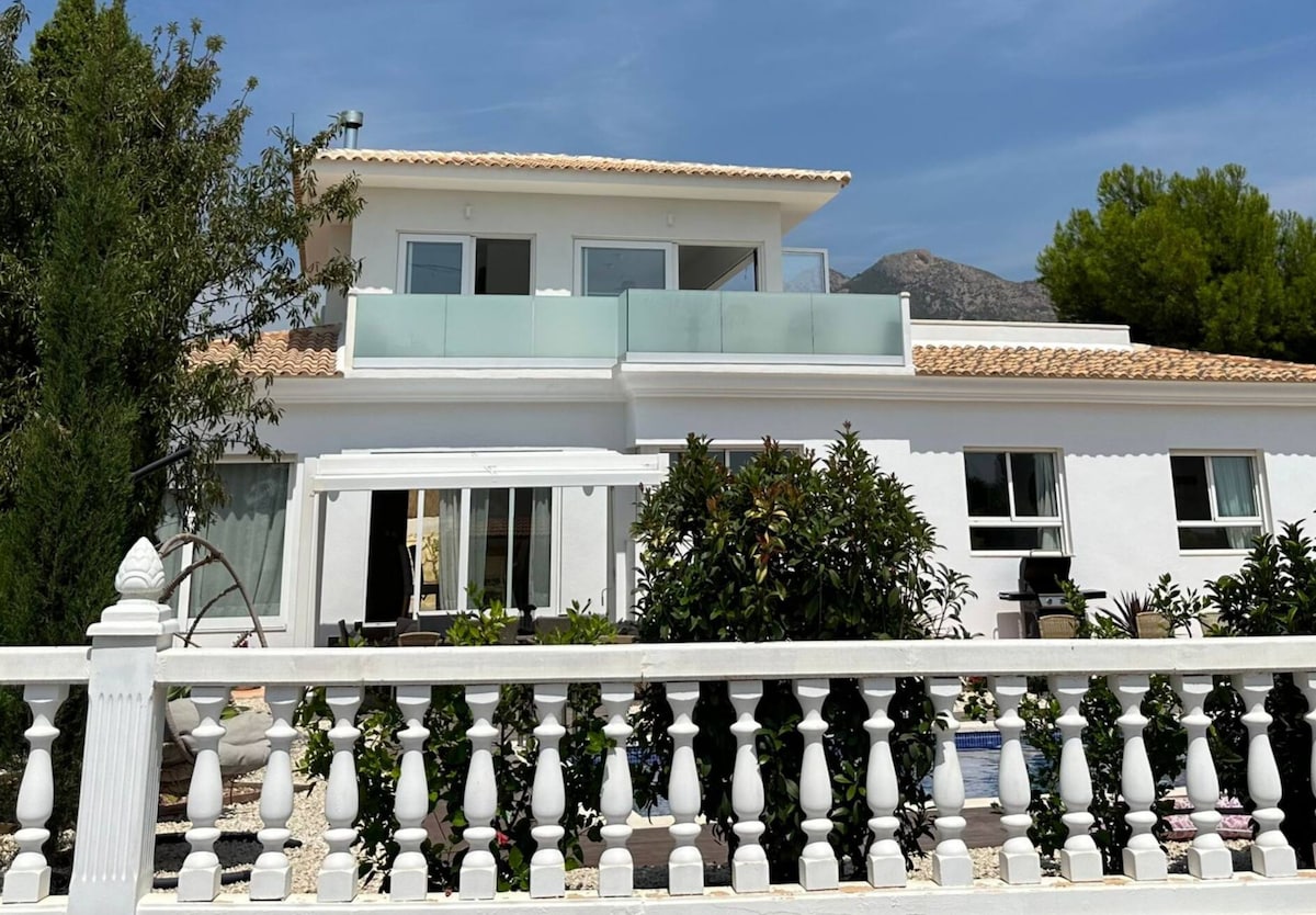 Vidunderlig fritliggende villa, helt ny, med udsigt og tæt på havet og bugter, og med en fælles pool. Juli og august, minimum 6 nætter, til gengæld har vi justeret priserne. Yderligere 30 % rabat ved tidlig booking (6 måneder eller mere). Meget roligt bugtområde. Strategisk beliggenhed, mindre end 30 minutter i bil fra lufthavnen (ALC), og de mest turistiske byer: Benidorm, Alicante, Villajoyosa, San Juan... 45 minutter fra Guadalest, og mindre end 2 timer fra Valencia.