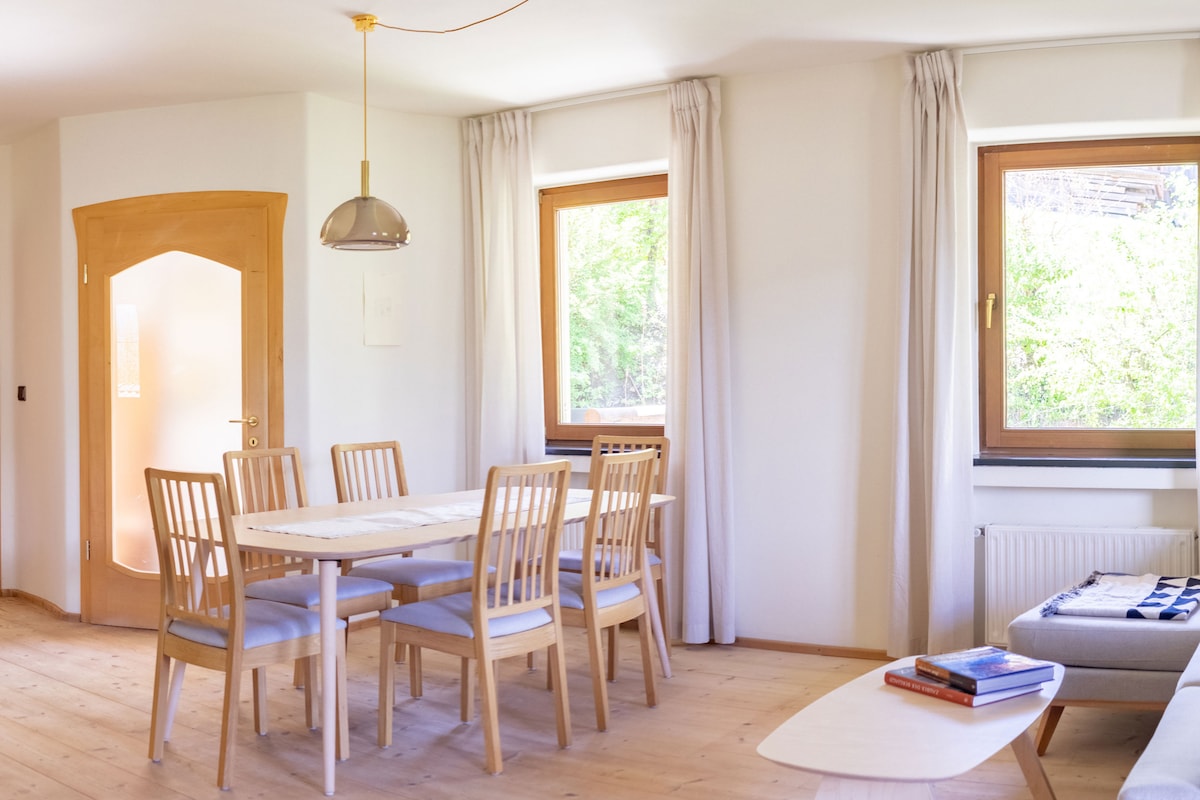 Du vil elske min bolig på grund af den rolige beliggenhed midt i enge og skove. Den smukke udsigt fra lejlighedens balkon, hvor du kan nyde stjernehimlen med et glas vin. Med lidt held kan du også se et vildt dyr, såsom en hjort eller en rådyr. Til din frokost eller middag kan du hente friske urter fra urtehaven og frisk mælk og æg fra vores kyllinger, til morgenmad er der også hos os. Sydtyrolpasset er gratis.