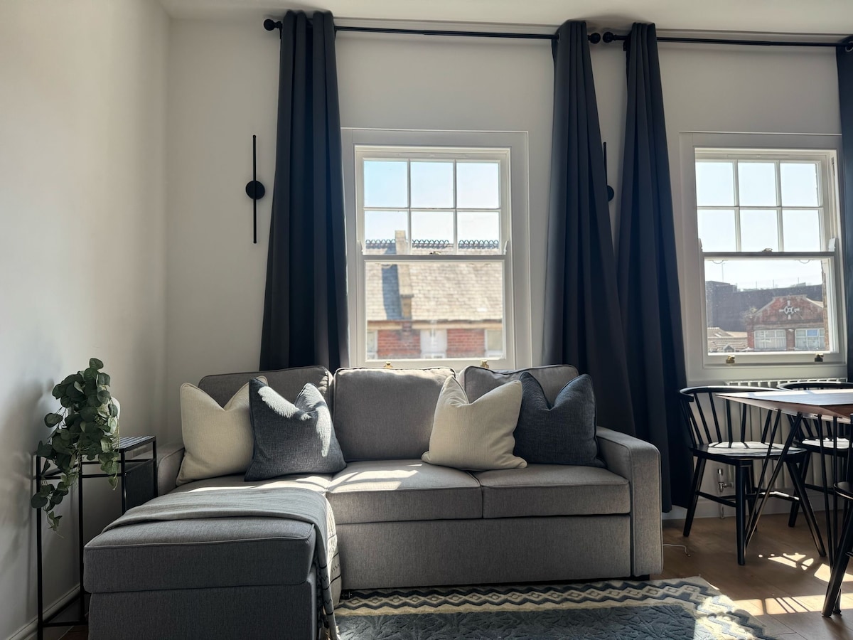 Dejlig lys og rummelig lejlighed med en kingsize-seng i UK. I hjertet af byens centrum, tæt på butikker og restauranter. Luton lufthavn - 11 minutter med tog; med bil 20/30 minutter. Lejligheden omfatter et stort opholdsområde med køkken og spisebord, badeværelse og soveværelse med en kingsize-seng i britisk størrelse Gratis parkering på en tildelt plads på privat parkeringsplads 2 minutter væk fra lejligheden. PARKERING ER KUN EFTER AFTALE Lejligheden ligger over for en pub (lukket pr. september 2025). Men vi har meget få indberetninger om støj.
