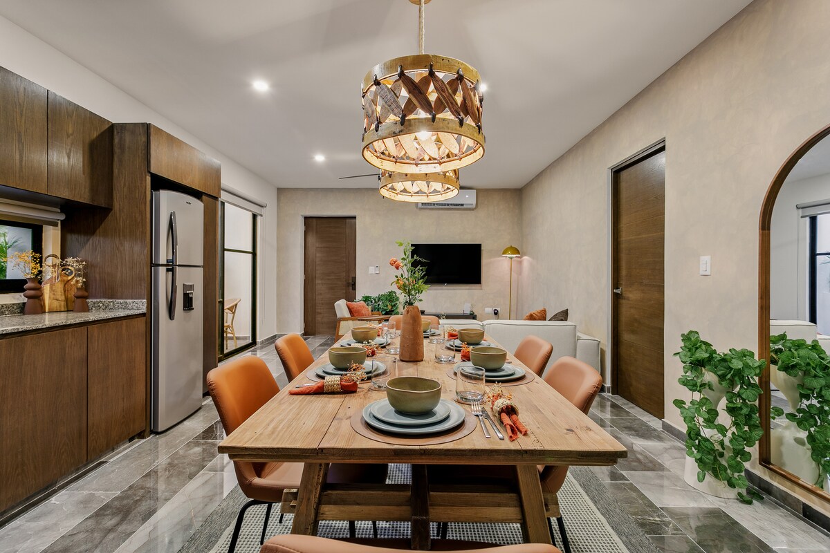 Tag på ferie til dette luksuriøse tropiske fristed med privat parkering🚗, smartlåse, en stilfuld stue, gourmetkøkken, spiseplads, central have 🌿og en designerpool med gynger, liggestole og jacuzzi💧. Omfatter 2 soveværelser, 3 badeværelser, en bar med palapadæk, der forbinder poolen og køkkenet, privat biograf🎬, vaskerum, et afslapningsrum med en professionel massagemaskine og 75" Sony smart-tv'er📺. Et uforglemmeligt ophold venter i hjertet af Cancúns livlige
