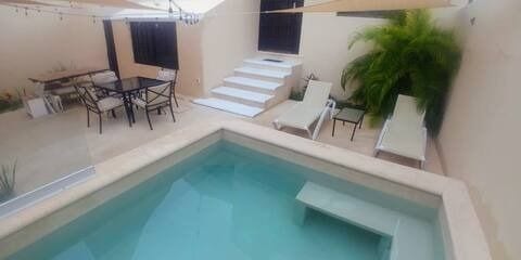 Smukt, rummeligt, nyrenoveret hus i hjertet af downtown Cancun. Dette fortryllende rum har 3 store soveværelser med aircondition, en rigelig stue, 2 43" tommer tv, en moderne spisestue, fuldt udstyret køkken, 2 komplette badeværelser ( 1 bruser/1 stort boblebad), et vaskerum og et privat fitnesscenter. Der er også en terrasse og en garage med en elektrisk dør. Tæt på indgangen til Hotel Zone, indkøbscentre, supermarkeder (5 minutters gang til Chedraui) og mange populære restauranter!