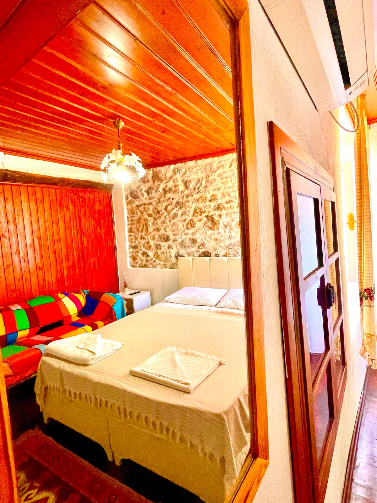 Vores sted ligger i centrum af Ayvalık. Det ligger på 2. sal i det historiske græske palæ i Ayvalık. Vores charmerende stenrum fra gulvet. Når du kommer hertil, kommer du med romatmosfæren fra de historiske smalle gader i Ayvalık. Dette værelse har 1 dobbeltseng og en sovesofa ved siden af. Sengen vokser og udvides. En person kan sove komfortabelt. Vi har en fælles terrasse med en storslået udsigt over Ayvalik. Vi anbefaler, at du ser solnedgangen på vores terrasse.