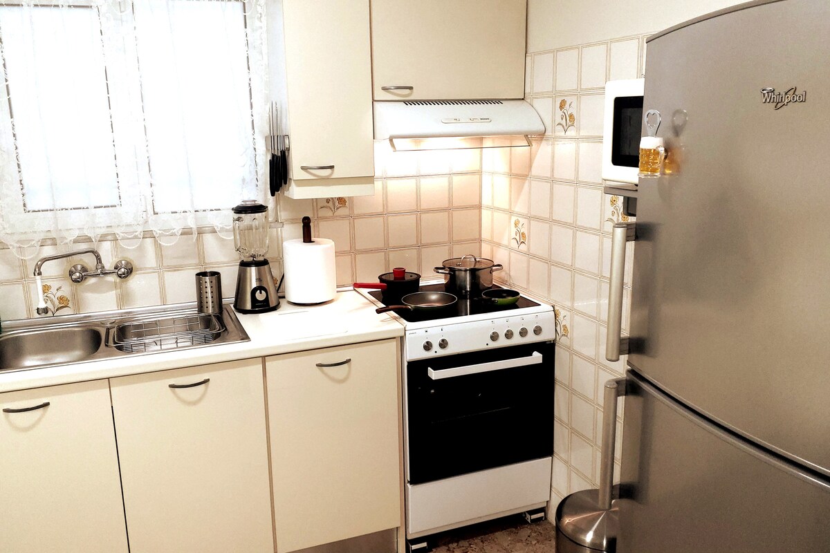 Moderne lejlighed fuldt renoveret, 70 kvm med 40 kvm have i hjertet af det sydlige Athen, kun 2 km fra den spektakulære strand i Athens Riviera og 1300 meter fra Alimos metrostation (10 minutter til Akropolis). Denne bolig ligger i et fredeligt kvarter, perfekt til familier og par. Fuldt udstyret køkken, smart-tv med Netflix-abonnement, højhastigheds-WiFi, fuldt udstyret badeværelse, en overlegen seng til to, sovesofa til to og en enkelt bærbar seng.