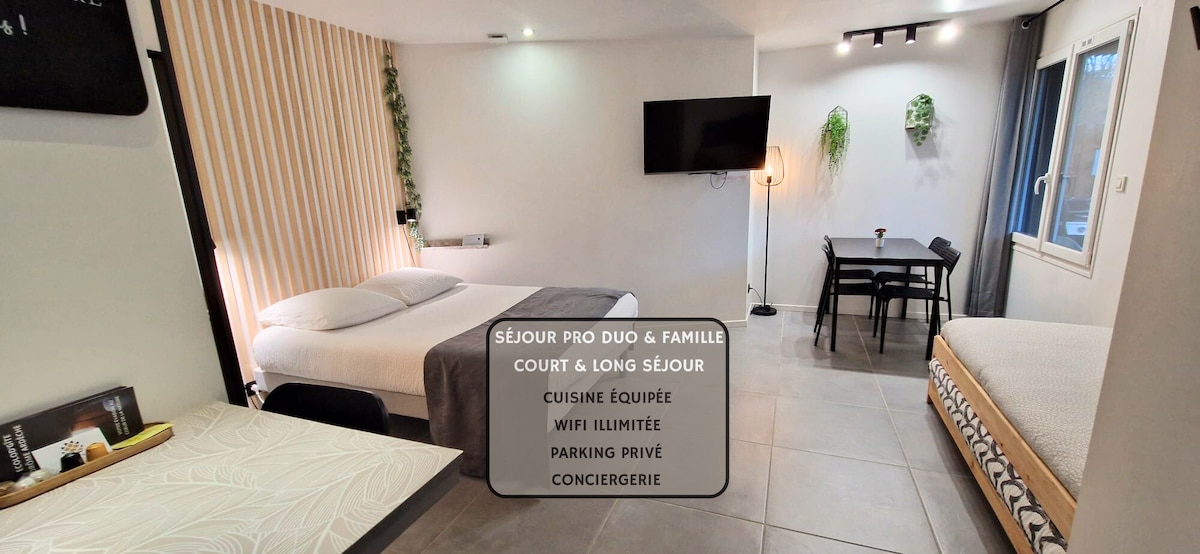 Vi vil med glæde byde dig velkommen under de bedste forhold i Faubourg-lejligheden. Lejligheden på 120 m2 er udelukkende beregnet til udlejning! Tæt på centrum, to minutters gang fra Palais des Congrès Jacques Chirac og Pathé-biograferne. 10 minutters gang fra Valence bybanegård. Den ligger på 2. sal uden elevator i en lille, meget rolig ejendom, der kun har 3 etager. Kan ikke lejes til at holde fest. Ikke-rygerlejlighed.