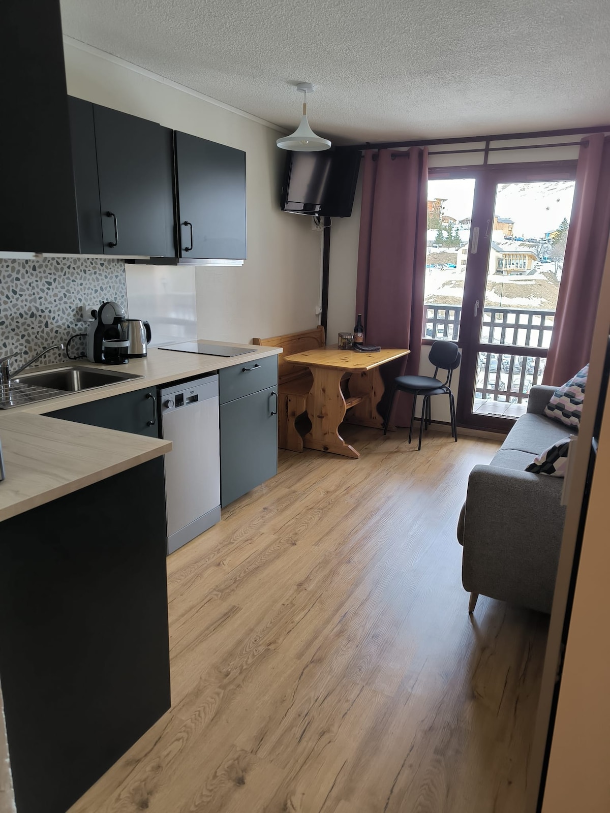 Studio 28 m2 med udsigt over pisterne, ski lige ved døren. ESF, skilifte, butikker lige ved siden af. Lejligheden er fuldt udstyret: WiFi, stort TV, hi-fi, DVD-afspiller, raclette og fondue, senseo, opvaskemaskine, miniovn, mikrobølgeovn, kedel, brødrister. Husholdningsprodukter, olie, eddike, sukker, salt, peber, er til rådighed. Mulighed for leje af sengetøj: 10 euro per person. Gratis shuttle til stationen i sommersæsonen, vinter: stop 50 m. depositum: 100 euro