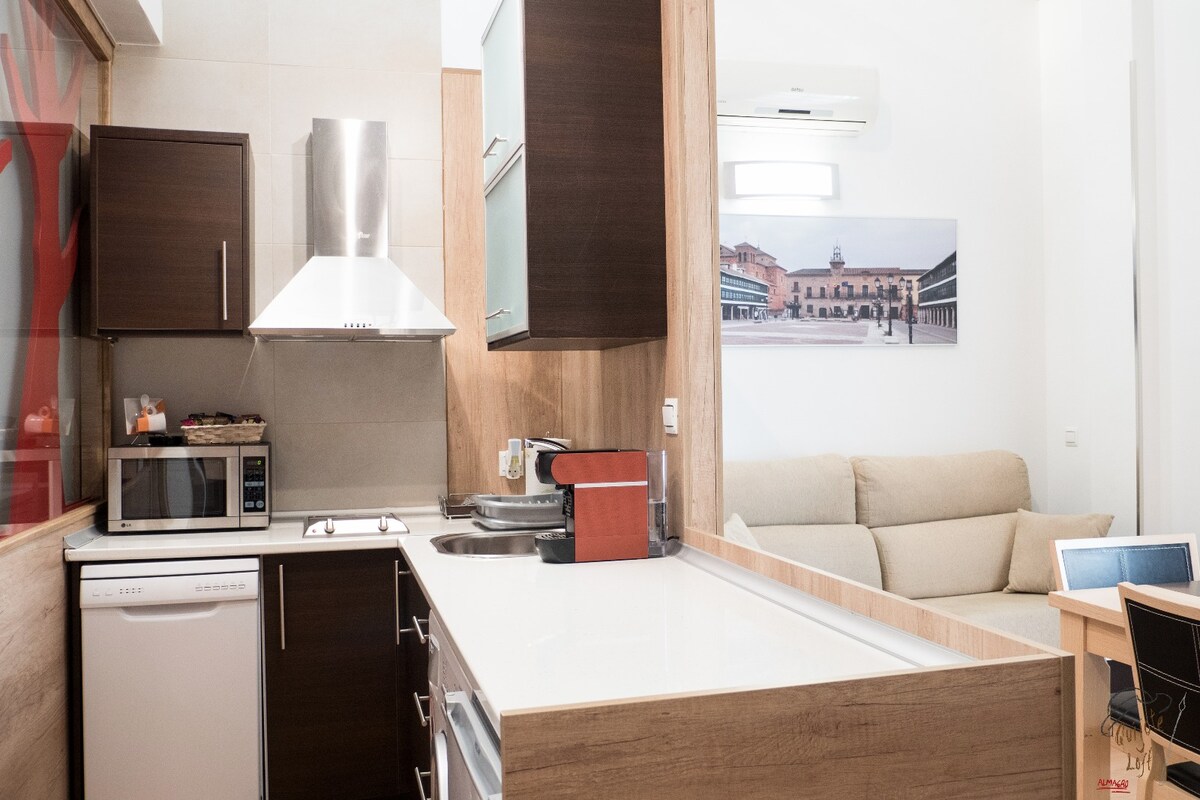Tilbring et par dage i Daimiels centrum i dette centralt beliggende studie, kun få meter fra de vigtigste barer, restauranter og butikker. Studiet er beliggende i en historisk bygning, bygget i begyndelsen af det 20. århundrede, og er en del af det monumentale kompleks Plaza de España. Den er blevet fuldstændig renoveret og er fuldt udstyret. Den er 27m2 og har en stue-soveværelse (med sovesofa), spiseplads, køkken og badeværelse.