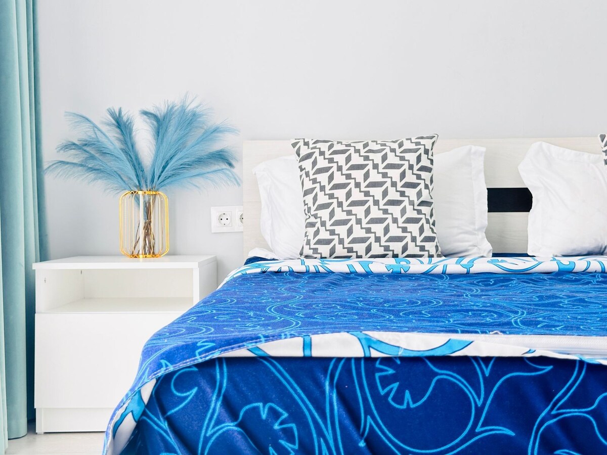 Hyggelig moderne lejlighed med komfortabel seng og sofa, rummelig bruser, balkon og arbejdsområde. Det fuldt udstyrede køkken er udstyret med alt, hvad du skal bruge for at tilberede. Boligen er gennemtænkt til hvile og arbejde. Der er mange caféer og restauranter nedenunder, og ved siden af Mega Park indkøbscenter, hvor du kan bruge tid på shopping eller underholdning.