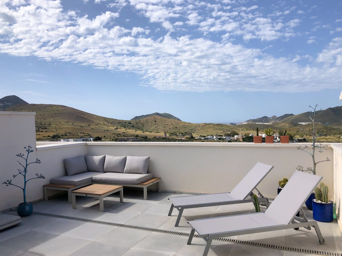 Et helt særligt hus på grund af dets beliggenhed, design og indretning. Beliggende i byen Las Negras, 10 minutters gang fra byen og stranden. Det støder op til naturparken i en helt rolig enklave, hvor du kan nyde en vidunderlig stjernehimmel. Swimmingpoolen og det udendørs opholdsområde er helt privat og vender ud mod naturparken. Den har 3 soveværelser, 3 badeværelser, 2 stuer, filmprojektor, sportsudstyr, udendørs køkken, 2 pejse osv.