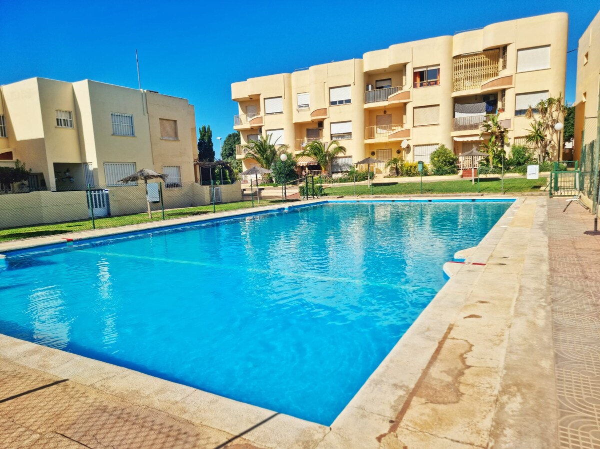 Storslået lejlighed, hvor du kan nyde et par dages hvile og afslapning ved siden af Cabo de Gata og strandene. Ved siden af golfbanen og en kort gåtur fra stranden. Sol dig på en af husets to terrasser/haven. Det har to soveværelser, det vigtigste med badeværelse, fuldt udstyret køkken og en stue med direkte adgang til haven. Få adgang til den fælles pool direkte fra hovedterrassen/haven. Privat parkeringsplads. 600 MB fiber Wifi, NETFLIX, aircondition.