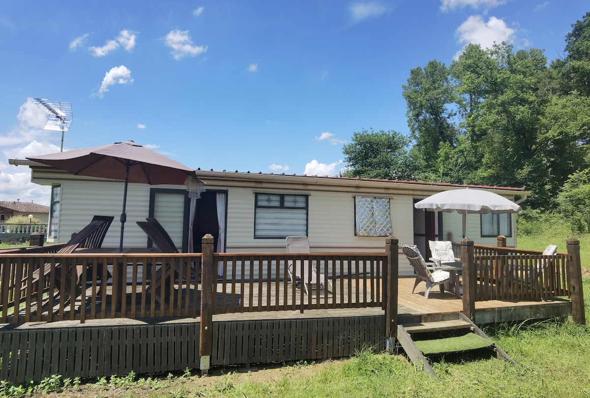 - Mobilhome til 4 personer 44m2 / reversibel aircondition og terrasse. -2 soveværelser (sengetøj medfølger) / køkken / indendørs og udendørs opholdsstue / badeværelse - Parkering på stedet / afslapningsområde med spa (maj til oktober), motionsapparater, have møbler Mulighed for rengøringspakke Beliggende i Chalosse, i Gaujacq, på landet. Fantastisk udsigt og med udsigt til Pyrenæerne Mulighed for at leje el-cykler på stedet "Chalosse Evasion" Kontakt os for yderligere oplysninger