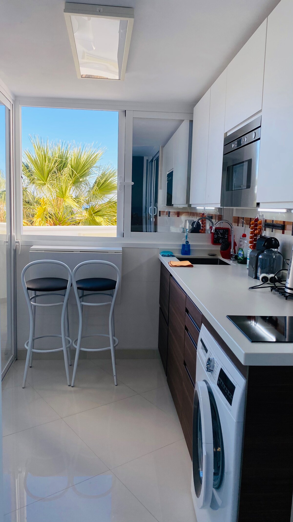 MAJ TILBUD. Vores penthouse suite har en stor terrasse, panoramaudsigt og moderne indretning med en seng på 150 cm. Alt hvad du behøver i køkkenet og et stort badeværelse. Omgivet af supermarkeder, frugthandlere, apotek, banker og stranden 300 meter væk. Bemærk, at denne penthouselejlighed ligger på 4. sal uden elevator. Grillen er ikke tilgængelig i oktober