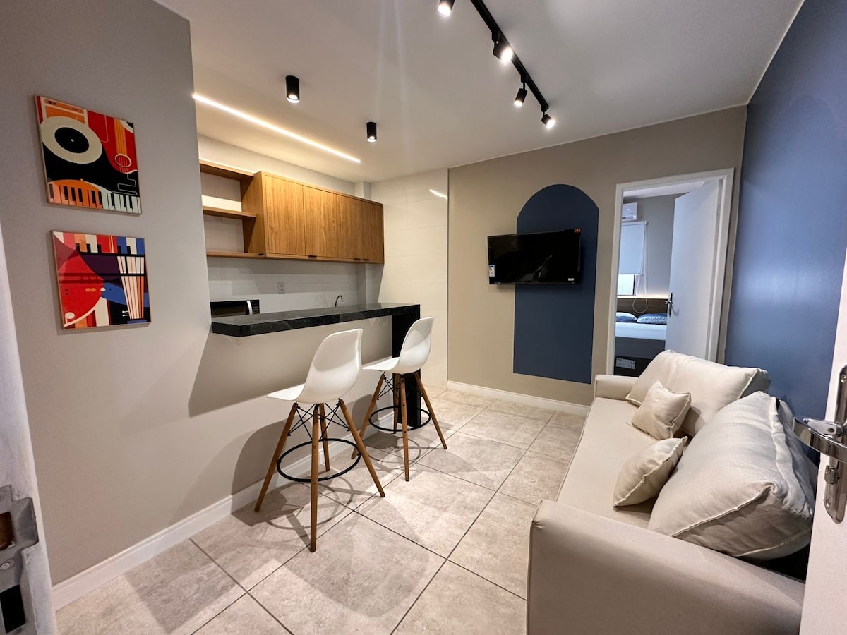 Nyd en førsteklasses oplevelse med panoramaudsigt over Belém. Studiet skiller sig ud ved sin funktionalitet: skillevæggen med en dør adskiller soveværelset fra stuen, hvilket giver overlegen privatliv. Slap af på dobbeltsengen eller den komfortable sovesofa (ideel til den 3. gæst). Der er garanti for underholdning på 65" smart-tv, som omfatter Netflix Premium i abonnementet. Køkkenet er komplet, og Studio-lejligheden har elektrisk bruser, hårtørrer og strygejern. Du kan slappe helt af takket være den eksklusive overdækkede garage.
