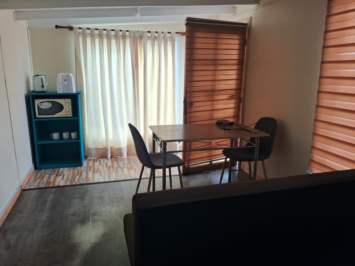 Acogedor Departamento para 2 Personas Disfruta de un espacio cómodo y funcional, ideal para parejas o viajeros solos. Totalmente equipado con cocina estilo americana (microondas, hornos, encimera, menaje), Wifi de alta velocidad, TV por cable, habitación matrimonial y baño privado. Diseñado para ofrecer tranquilidad y confort, es perfecto para una escapada romántica o viaje de negocios. ¡Un lugar acogedor que te hará sentir como en casa!