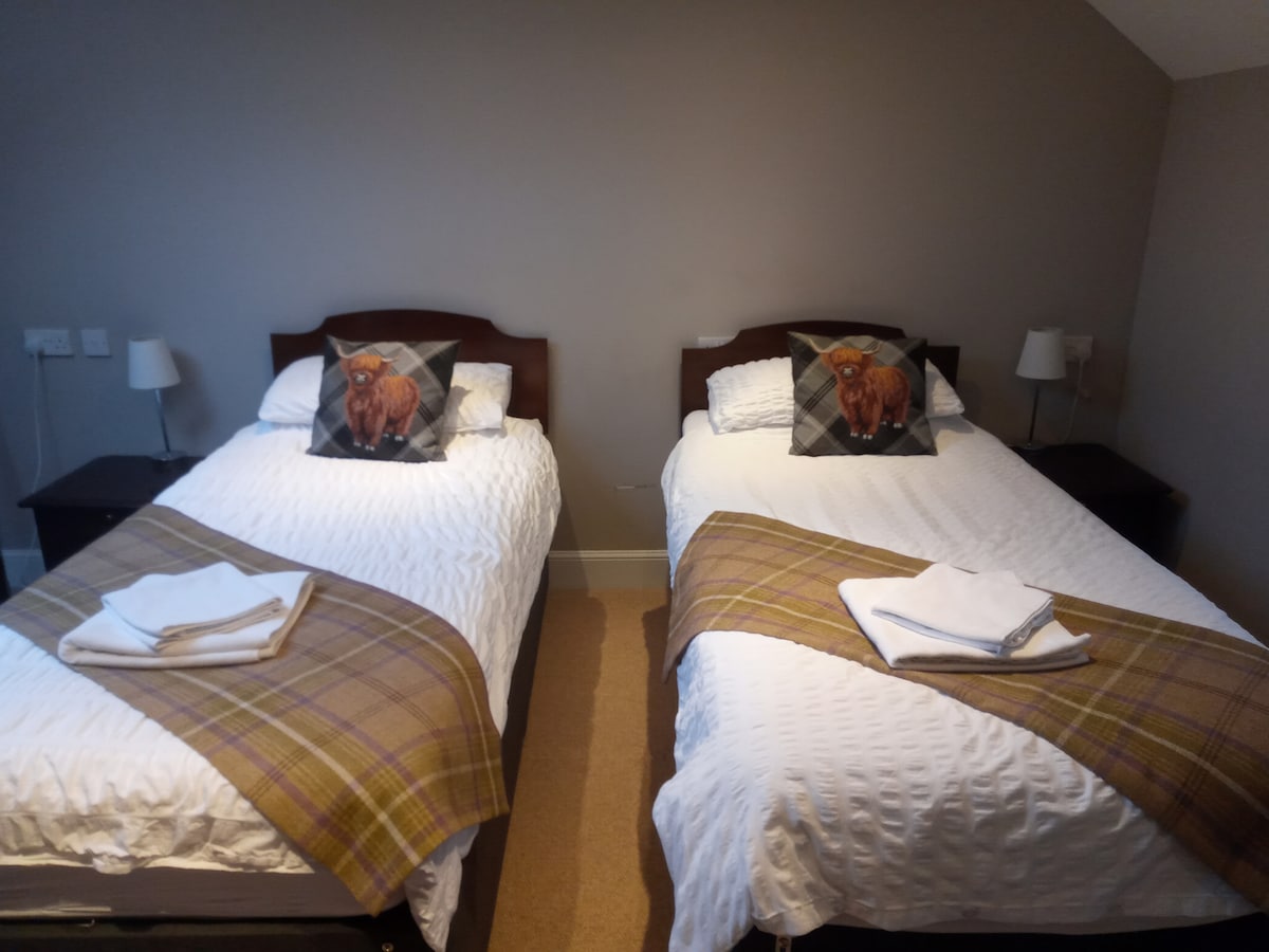 Varmt værelse ovenpå med behagelig kingsize-seng, eget badeværelse med bruser. Dette værelse har også en enkeltseng, der kan rettes, hvis der anmodes om det. Inkluderet er kaffe, te osv. og en gryde med havregrød/korn/frugt/toast til morgenmad. Bar & Restaurant i hotellet (anden organisation) åben onsdag-søndag, måltider bedst booket direkte via telefon, vi kan videregive deres nummer til dig, når du har foretaget din Airbnb-booking. Til aftenmåltiderne mandag-tirsdag tilbyder vi Oakhouse Foods frosne komplette måltider.