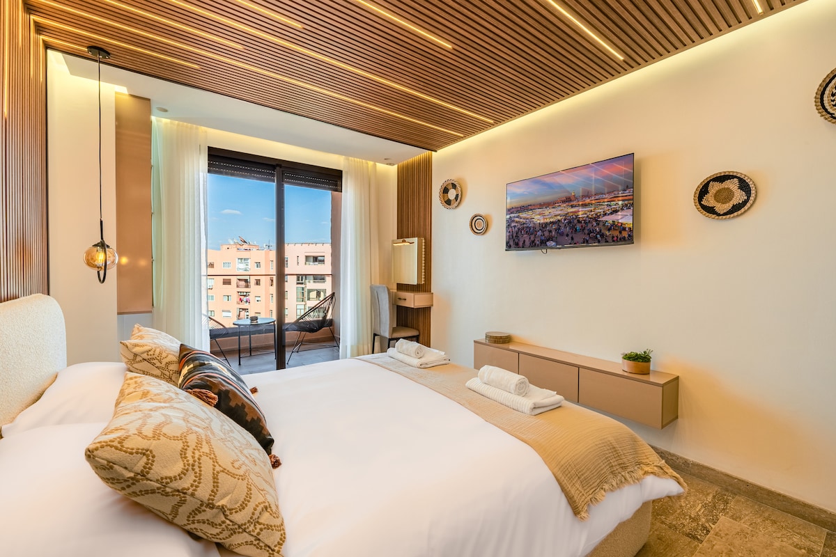 Nyd en elegant oplevelse i denne luksuriøse, ultra funktionelle og lydisolerede lejlighed i centrum af Gueliz. Med central klimaanlæg som i de bedste hoteller, har du en fantastisk udsigt over "Place du 16 Novembre" og luksusbutikkerne. ✓ Internet med 100 megabit fiberoptisk forbindelse ✓ Møbleret med elementer af højeste kvalitet Sikret ✓ bolig 24/7 med portner og sikkerhed ✓ Kvalitets sengetøj skiftes efter hvert ophold Kontakt os!