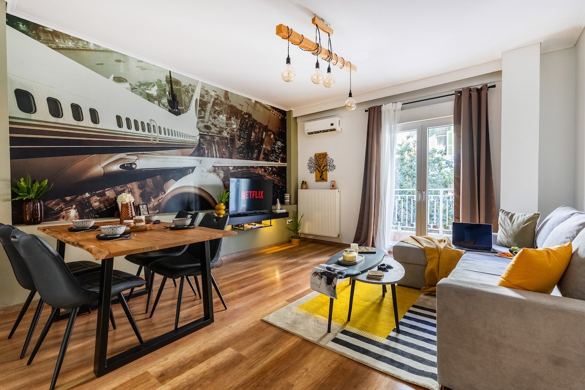 ✨ Moderne lejlighed i det centrale Thessaloniki ✨ Stilfuld og lys lejlighed med 2 soveværelser – hvert med en komfortabel dobbeltseng – plus en hyggelig stue med en sovesofa, der kan åbnes for at sove yderligere to gæster. Har en privat balkon, smart-tv, fuldt udstyret køkken (Nespresso, ovn, mikrobølgeovn, køleskab), moderne badeværelse med varmt brusebad, vaskemaskine, hurtig WiFi, babyseng, aircondition til både varme og køling, elevator og nem indtjekning – perfekt til par, familier eller venner.