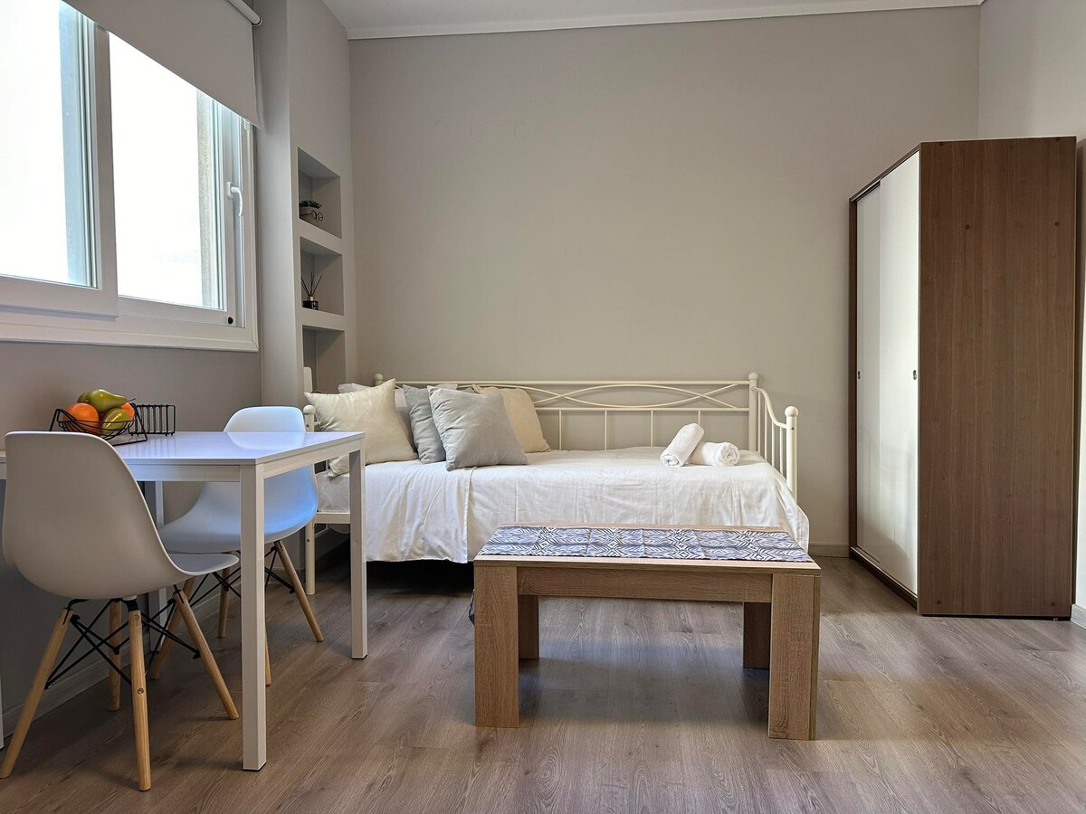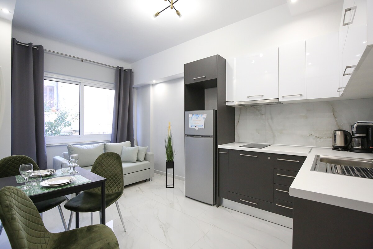 ●Denne rummelige og moderne lejlighed er ideel til op til 6 gæster. Den er● fuldstændig renoveret i unik æstetik og omfatter et fuldt udstyret køkken, 2 soveværelser, et dejligt badeværelse og en balkon. ●Ejendommen er perfekt beliggende blandt de store kulturelle og historiske steder; 5 minutter fra Aristotelous-pladsen, 3 minutter fra St. Sofias plads. ●Du bor i et sikkert nabolag med masser af butikker, supermarkeder, restauranter og caféer i nærheden samt et døgnåbent marked.