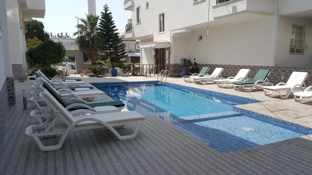 Denne lejlighed er godt dekoreret og giver hjemmets komfort. Du kan samle vidunderlige ferieminder med din familie og dine kære. Få dine bekymringer på dette rummelige og rolige sted. 24 timers sikkerhed. Legeplads for børn. En pool, der rengøres dagligt. Der er mange supermarkeder og restauranter i nærheden. I anlægget; Der er et fitnesscenter, café, sauna, tyrkisk bad, dampbad og frisør.100 mbps hurtigt internet. Lufthavnen er kun 10 minutter. Lara strand ligger 5 minutter derfra.