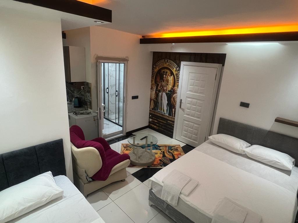 Vores Superior Suite-lejlighed har 1 dobbeltværelse, en rummelig stue, 2 foldbare sovesofaer og et køkken med et bord, 1+1 med en størrelse på 56 m2 boligudstyr gennemtænkt ned til mindste detalje i vores lejligheder du kan bo op til 5 personer. Vores facilitet ligger 15 minutter i bil fra lufthavnen og 10 minutter fra strandene. Vi håber, du nyder Middelhavet og de tjenester, vi tilbyder dig under dit ophold, hvor du vil føle komforten i Shine Suite på hver kvadratmeter
