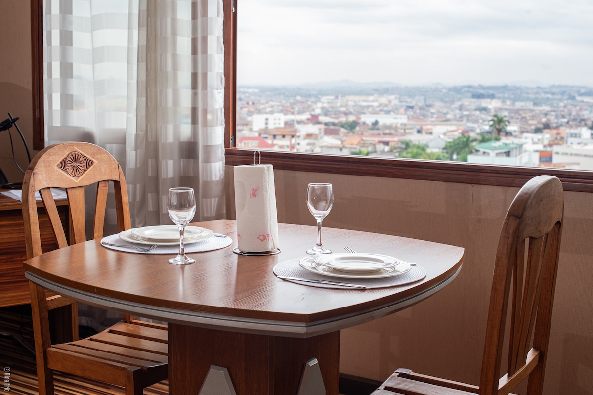Beliggende i Panoramic Residence, en stue med udstyret åbent køkken, tre soveværelser og en mezzanin; to badeværelser. Wi-fi-balkoner, satellit-tv, minibar, Noget andet. Antananarivo står i øjeblikket over for vandproblemer, der er 2 reservebeholdere i lejligheden, men i tilfælde af fejl i Jirama er det nødvendigt at fylde disse tanke manuelt via en pumpe foran lejligheden. I tilfælde af strømafbrydelse har lejligheden ikke en redningsgruppe.