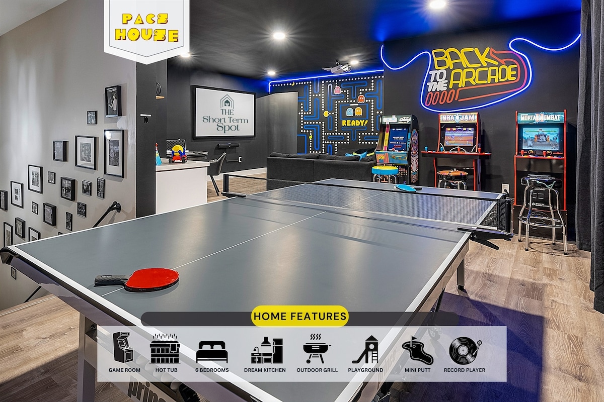 🎯 Det ultimative sjove hus til familier og venner! Kamp i spilrummet med 3 arkadespil, bordtennis, brætspil, poker og en 100" projektor. Slap af udenfor i spabadet til 7 personer, ved bålpladsen, ved barvinduet eller på den private putting green. Nip til en margarita, mens børnene nyder legepladsen! Indenfor kan du spille vinyl på pladespilleren, slappe af ved det 85" baggrundsbelyste tv og slappe af i den enorme master-suite med dobbelte regnbrusere. Kun 5 minutter til stranden!