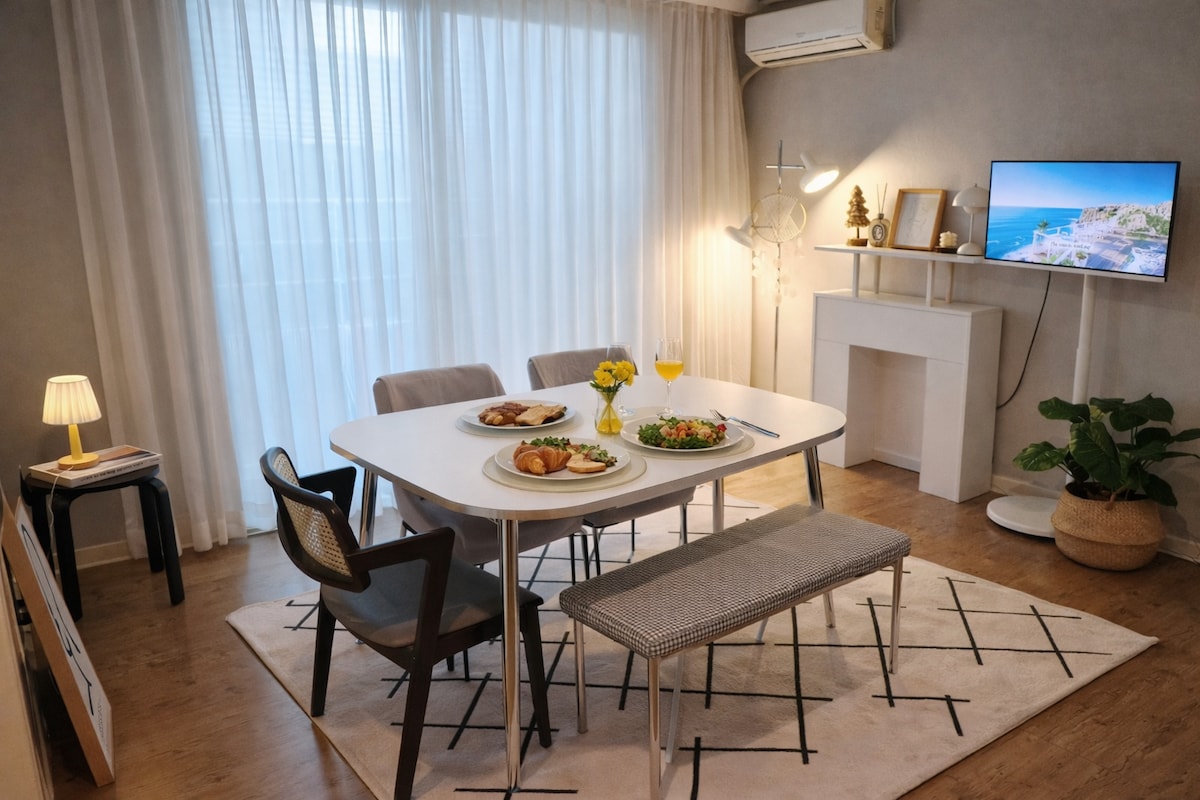 🍀숙소설명을 필독 해주세요🍀 호스트가 직접 관리하는 숙소입니다🩵 매일 방역 및 청결하게 유지하고 있습니다. ✔️체크인 4pm ✔️체크아웃 11am (리뷰이벤트 참여시 호스트와 상의) 📌숙소 옵션 -삼성 스마트 TV -삼성 시스템 에어컨 -초고속 wifi 지원 -삼성 스타일러 -드럼 세탁기 -전자레인지 📌주방 옵션 -인덕션 2구, 전자레인지 -머그잔/와인잔 -s접시/m접시 -냄비1개 -조리도구(집게,국자,가위,칼) -수저셋트 📌저희 숙소는 간단한 조리(라면)만 가능합니다‼️ 참고해주세요!!😉🙏 ❌삼겹살,스테이크, 국, 찌개류, 파스타❌ 📌화장실 옵션 -핸드위시 -폼클랜징,클랜징오일 -샴프/컨디셔너/바디워시 -바디로션 -화장솜/면봉 -헤어드라이기 고데기