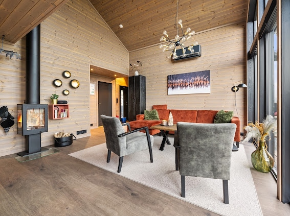 Denne charmerende hytte er det perfekte tilflugtssted for hele familien. Med moderne indretning og rummelige opholdsrum kan du nyde komforten, mens du nyder den utrolige natur omkring dig og den smukke udsigt. Hytten har masser af plads med flere soveværelser og fællesområder, der er perfekte til afslapning og hygge. Uanset om I vil tilbringe tid sammen omkring pejsen, lave mad sammen i det veludstyrede køkken eller slappe af på terrassen.