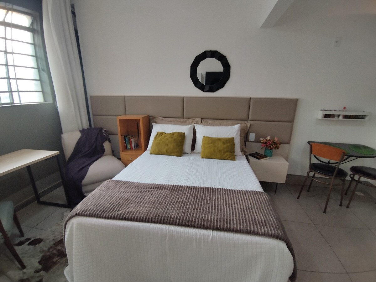 Luksuriøst loft, 45 m2, aircondition, bord til 4 personer og bænk, komplet og udstyret køkken, vaskemaskine, tørretørrer, maskine. Nespresso og andre praktiske ting. Meget rummelig med queensize seng, 1 sovesofa og 55'' Smart TV med wifi og internet. Smuk udsigt. Fælles udendørs område: Komplet fitnesscenter, vaskeri, opvarmet swimmingpool, jacuzzi og sauna. Privilegeret beliggenhed tæt på Diamond, Hosp. Materdei, Mercado Central de BH, Supernosso osv. 1 parkeringsplads og dørmand døgnet rundt Faciliteter, der får dig til at føle dig hjemme!
