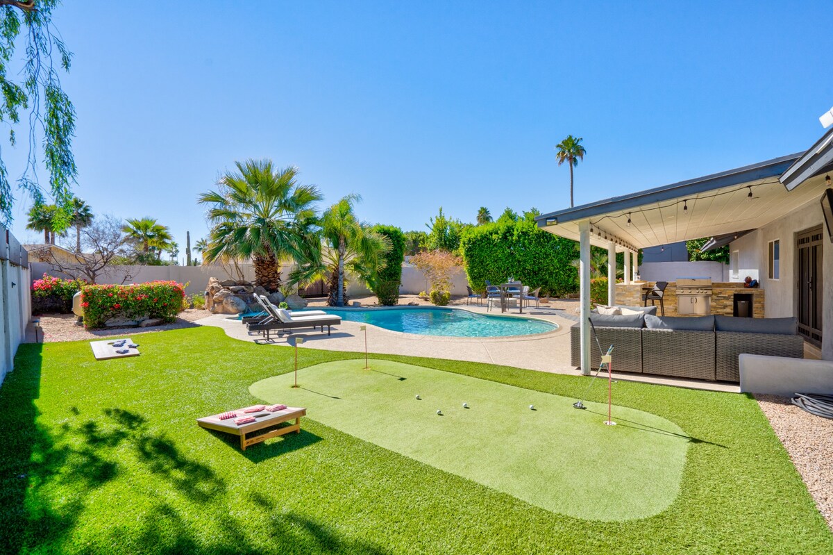 Smuk 7-sengs, 4,5 bad med plads til 16 i et roligt kvarter i hjertet af Scottsdale-området, tæt på restauranter, natteliv, vandreture, golfbaner og kurbade, perfekt til familier, par eller fyre/piger. Celebrity Greens putting green, opvarmet pool, tåget terrasse og bålplads. Opgraderet køkken, fitnessrum og spilrum med vådbar, billard, flipper, Golden Tee og bordtennis. En ombygget casita med 3 senge og 2 badeværelser er ideel til privatliv og grupper med flere familier. BRYLLUPPER OG LIGNENDE BEGIVENHEDER ER STRENGT FORBUDT.