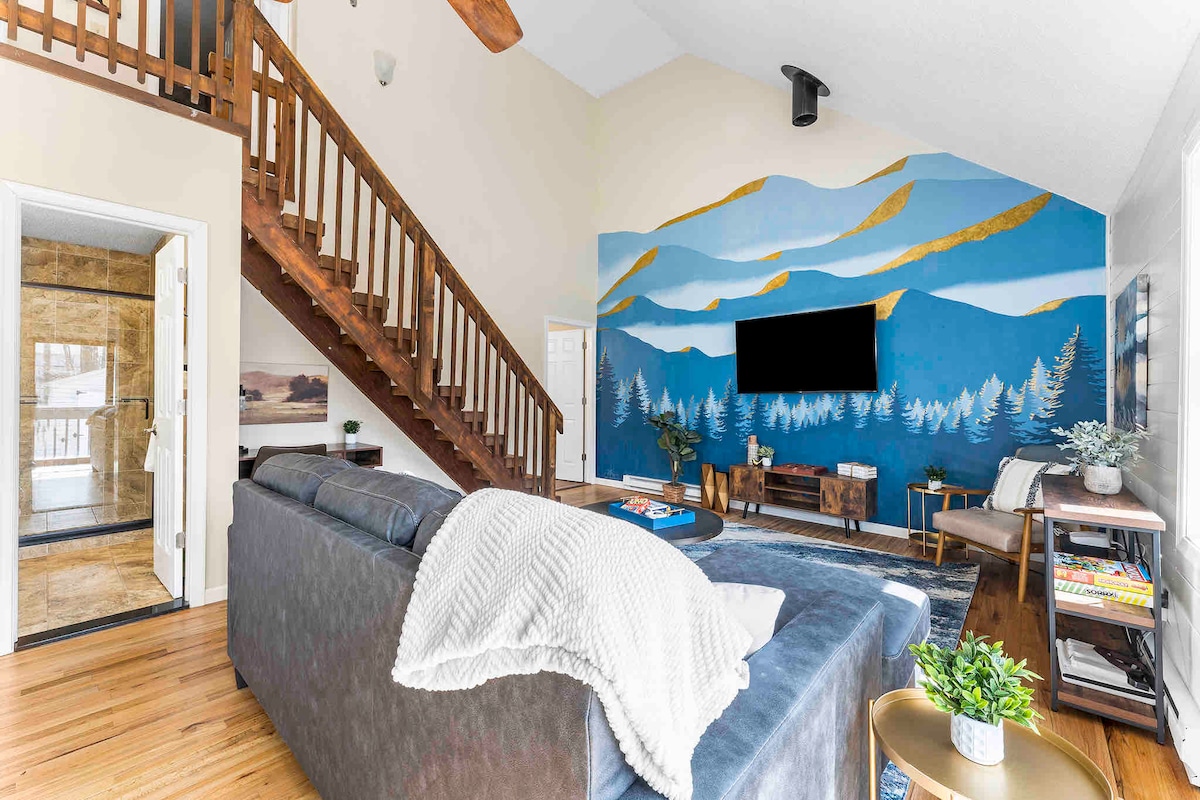 Tag på en hyggelig efterårsferie i nærheden af Kalahari, Mount Airy Casino, Crossings Outlets, Lake Wallenpaupack og Tobyhanna State Park 3 km væk med efterårsblade, bjergluft, søudsigt, dyreliv og picnicsteder. Beliggende ved en ujævn privat vej. Denne spa-lignende oase har et badekar, regnbruser, smart belysning, køkken med smart komfur, bløde senge, LED-spejle med musik og retro arkadespil. Perfekt til par, fødselsdagsferier eller familier, der søger et fredeligt Poconos-ophold med moderne faciliteter.